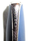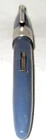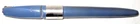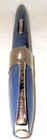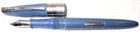 Vintage blue plastic Lord Baltimore lever fill fountain pen with chrome trim. 5-1/4" capped, 5" uncapped. Chrome pocket clip stamped "LORD BALTIMORE". The clip has some rust pitting. Cap has a unique triangular shape at the top that goes to round at the trim ring. A deep groove is in the cap above the ring. Stainless steel nib stamped "VERI---SMOOTH---MADE IN---U.S.A.---MEDIUM". There is some pitting along the ink flow groove, but the tip is okay. The pen's body has some fading, is warped a little, and the fill lever has rust pitting. If it has a bladder, it's probably unusable. Some believe this pen was sold through Rexall Drug Stores. Other vintage pens listed.