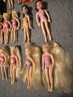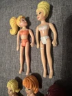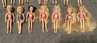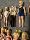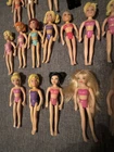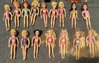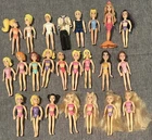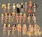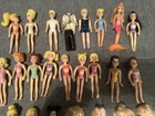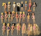 This lot of 22 Fashion Polly Pocket dolls includes both girls and boys with various hair colors such as blond, brunette, and red. Each doll is 3.75 inches tall and made of plastic, also included is the groom’s tuxedo and the extra is a Barbie Mermaid. The top left 4 are the MOH, bride w/ gem on finger, the groom, his tuxedo and his best man. Beside the best man is the Cinderella Polly pocket.