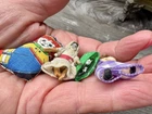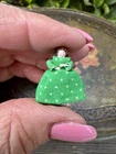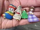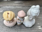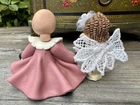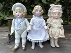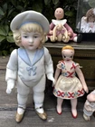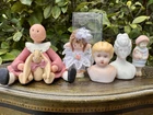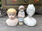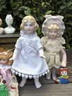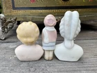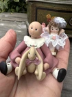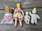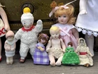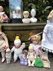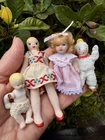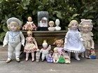 Offered here for your bidding fun is this BIG lot of LITTLE dolls, all small enough to fit in the dolls’ house! There are 16 dolls in total, measuring from roughly 1” to 5 1/2” tall. They are made from a variety of materials, but are mostly all bisque. The first few pictures showcase the entire group, with subsequent photos breaking them into smaller groups for purposes of study. Starting with the largest all bisque dolls, they are bisque reproductions of German antique dolls. The sailor boy is wire jointed while the two girls have elastic stringing. They all have molded and painted clothing of some sort, with the girls having fabric dresses as well. The sailor boy is quite convincing as an antique, but I do believe he is a repro. Next are featured two artisan polymer clay dolls, and three artisan all bisque dolls, 2 of which are just the shoulder heads. Of the clay dolls, one little girl is molded with her bunny rabbit toy. The other is very tiny, yet dressed in detail as a little fairy having a spectacular yarn sausage curl wig. The fairy comes in a little plastic display box. The bisque examples are antique reproductions of German parian type shoulder heads, and one is a German penny toy type doll. The next group of four really run the gamut—from an all bisque wire jointed baby, to an artist’s jointed clay doll reminiscent of a a Polish peg doll, and then a German snowbaby inspired doll, as well as a factory made all bisque toddler in a pink dress. Lastly, there is a group of four TINY dolls of various materials, including cloth, wire, and wood. A couple of these are inspired by the tiny German peg woodens of old. One is a teeny tiny reversible Raggedy Ann and Andy doll of cloth—very cute and charming! The doll in the green dress is so small, yet she even has a fancy yarn wig, with a tiny bow in her hair!! There’s plenty here to please all, and all for one bid! Please see my other listings for more antique and vintage doll finds, keeping in mind that I would be happy to combine DOMESTIC shipping whenever practical! If more than one item is won, please be sure to ask for, and wait for a revised invoice combining shipping BEFORE paying!