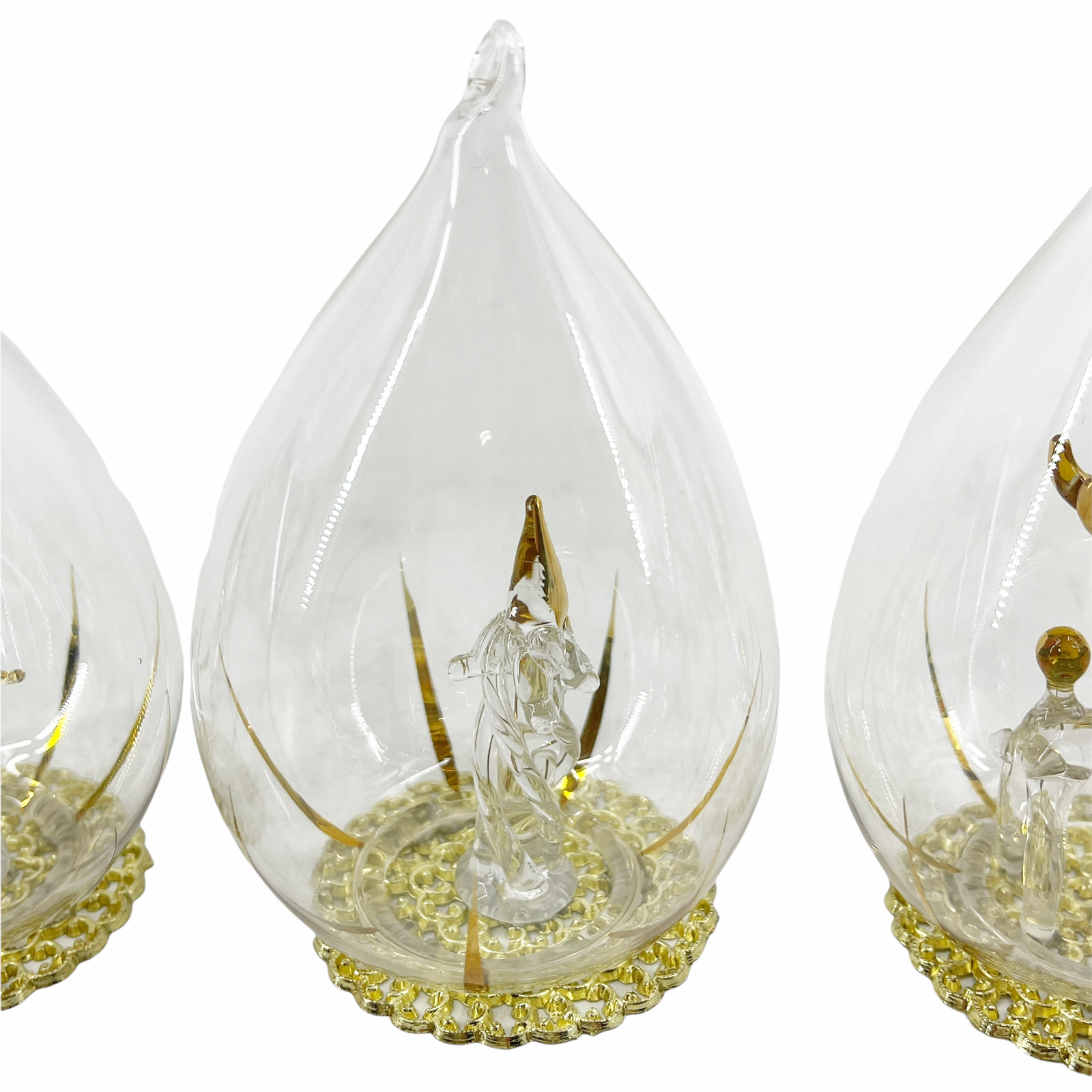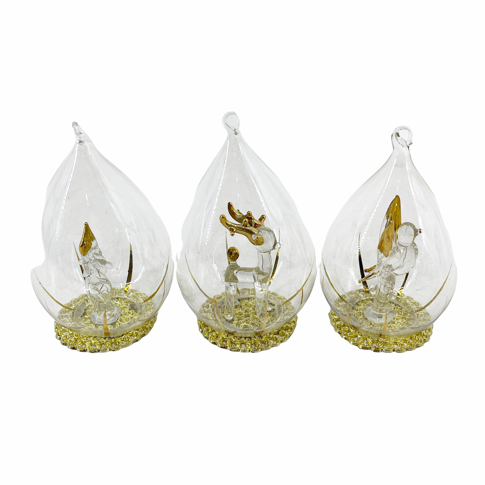Lot of 3 Vintage Blown Glass Teardrop Christmas Ornaments Figural Reindeer Bird 2 1/2" diameter and 4 1/4" tall. Blown glass figural inside each - reindeer, candle, and bird. Encased in teardrop shaped ornament with gold tone filigree base. Can be hung or are free-standing.