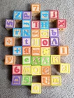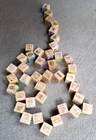This listing is for a beautiful set of 40 Children's Wooden Alphabet Number ABC 123 Building Blocks. Includes an assortment of letters, numbers, symbols, animals, and objects. Comes with a mesh storage bag to hold them all. Blocks measure approximately 1.75 inches. Preowned in excellent condition.