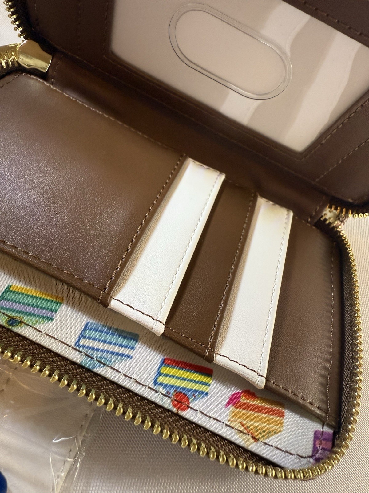 The “icing on the cake” is guessing which cake goes with each princess, based on the decoration adorning every delectable piece. The following Disney princesses are represented: Cinderella, Jasmine, Tiana, Aurora, Snow White, and Ariel. Note the coordinating inside lining, which includes a motif of slices of each cake. Wallet features include the following details: gold-colored metal hardware for the zipper and snaps, vegan leather (polyurethane), and applique and print work. New with tags Hard tag Loungefly