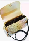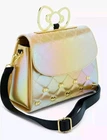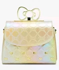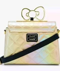 Make any look supercute with this Sanrio crossbody bag! Featuring a debossed quilt design of bows on the front flap, the metallic gold body is quilted with gold bow studs. With a figural bow top handle and a removable crossbody strap, this purse is perfect for fans of Hello Kitty. Don't forget the matching mini backpack, tote, and wallet sold separately! Polyurethane Approx. 10 1/4" W x 8" H x 3 1/2" D