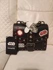 Bring the Dark Side to your look with this Star Wars purse! Featuring embroidered Empire icons and studded details, the front also includes a faux buckle on the front flap. With a chain top handle, a removable crossbody strap, and a TIE fighter bag charm, this bag is perfect for traveling the galaxy. Polyurethane Approx. 7" H x 8" W x 2 1/2" D