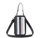 Introducing the Lug Pike crossbody bag, a versatile accessory suitable for various occasions. This bag features a black, grey, and white color scheme with a clear window for phone viewing. It has a rectangular shape with a zip closure and measures 4.125 inches in width, 7 inches in height, and 0.75 inches in depth. The bag has a crossbody strap and top handle with a handle drop of 4.5 inches and a strap drop ranging from 15.5 to 29 inches. It is made of polyester with a grey lining and gunmetal hardware. The bag has inner pockets, organizers, and dividers, making it an ideal choice for travel, weddings, parties, cocktail events, casual outings, formal events, workwear, and business. See pictures.