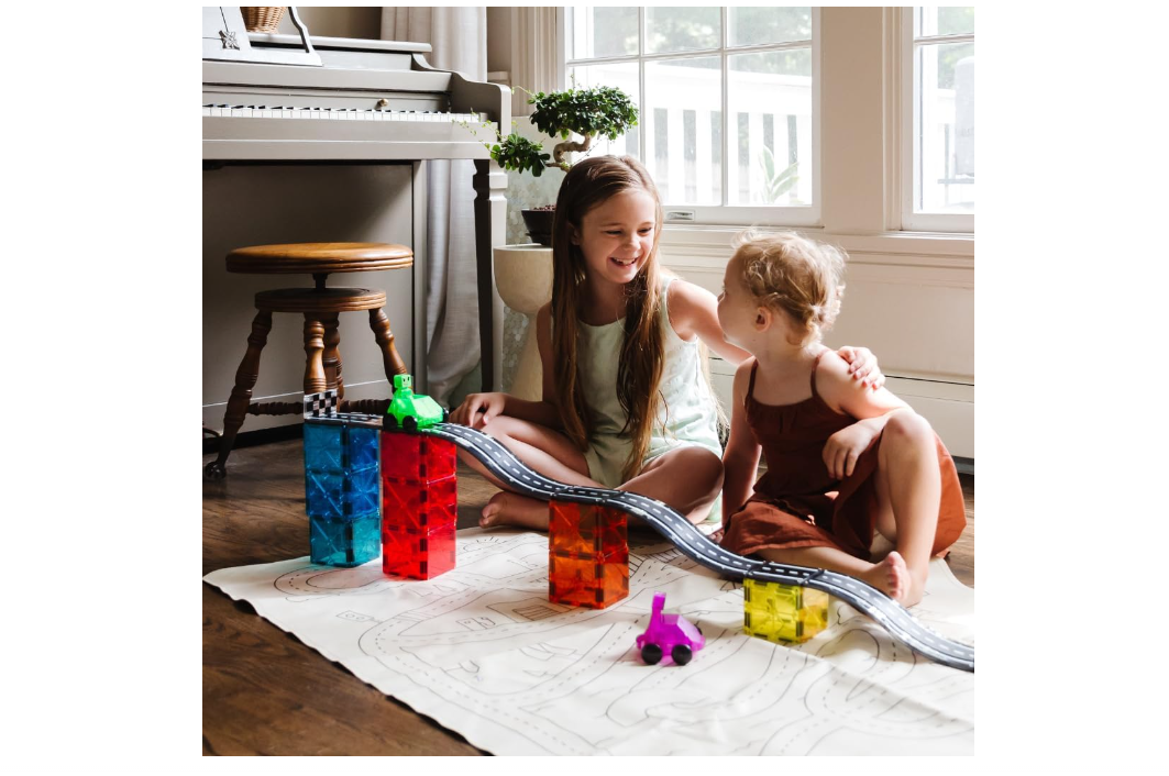 Car-loving kiddos, we have something for you! Introducing MAGNA-TILES Downhill Duo 40-Piece set, the first fully magnetic racing adventure that’s designed for little hands and big imaginations. Looking for a new way to inspire their creativity, build their motor skills, and support their STEAM learning? Buckle up and imagine the possibilities with new Ramps, Roads, Dashers and Figures! INCLUDES: 40 magnetic pieces, - 4 Ramps 9-1/4" x 2-3/4", 2 Vehicles 3-1/2" x 3-3/8" x 1-3/4" (Green and Purple), 2 Figures 1-1/4 x 1/2" x 2-3/4" (Green and Purple), 6 Road Squares 2-3/4" x 2-3/4", 2 Finish Line Rectangles 2-3/16" x 1-3/8" x 3/16" and 24 Squares 2-3/4" x 2-3/4". UNIQUE DESIGN FOR MOTION: Dashers are uniquely designed to ride along traditional Squares, Ramps, and Roads, offering a frustration-free way to introduce motion and STEAM learning. They seamlessly integrate with existing MAGNA-TILES sets. ENCOURAGES DEVELOPMENT: Playing with Dashers helps children explore cause and effect, develop hand-eye coordination, and enhance fine motor skills. It's a fun and educational tool that promotes learning through play. GREAT FOR GIFTING: This set makes an excellent gift for car-loving kids aged 3 and up. It's a delightful addition to any MAGNA-TILES collection, providing endless hours of creative and imaginative play. SUPERIOR QUALITY AND SAFETY: Made from food-grade, non-toxic MABS plastic, MAGNA-TILES pieces are BPA, phthalate, and latex-free. Designed to withstand extensive play, the secure lattice and fastening rivets ensure durability and safety for children.