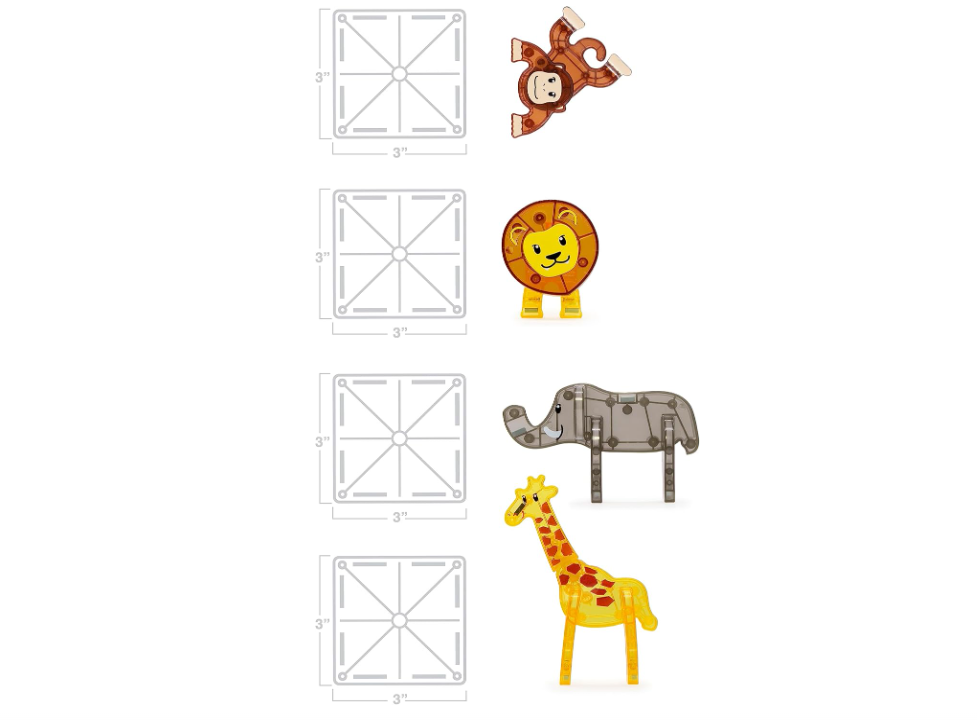 Imaginations are running wild with the MAGNA-TILES Safari Animals 25-Piece Set which includes 4 animals! Whether indoors or outdoors, at home or in the classroom, little explorers can let their curiosity lead the way, as they follow the footprints of each adorable safari animal through this vibrant colored habitat. From finding new ways to monkey around with the magnetic shapes to dreaming up creative creature adventures, the opportunities for imaginative play are endless with the Safari Animals from the MAGNA-TILES Animal Collection. INCLUDES: 25 pieces; 4 magnetic animal figurines, including a Lion, Giraffe, Monkey, and Elephant, 9 classic small squares, 6 classis equilateral triangles, 2 classic isosceles triangles, 2 classic right triangles, 1 arch and 1 pentagon. INTRODUCE STEAM TO YOUNG LEARNERS: Sparks a curiosity for STEAM topics as you explore the vibrant-colored habitat with your four safari sidekicks. MATERIAL: Made from only the good stuff, none of the icky stuff (we only use food-grade ABS plastic that’s free from BPAs, phthalates, and latex). GROW IMAGINATIONS: Savannah-themed set with leaf and footprint tiles in realistic colors encouraging open-ended/unstructured play, storytelling, and creativity. DIMENSIONS: Largest Piece: 4-1/2" x 4-1/2" Smallest Piece: 2-1/2" x 2-1/2" Box: 12-1/2" x 2-1/2" x 12" inches CHOKING HAZARD: Small parts. Not for children under 3 years.