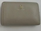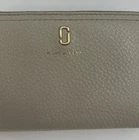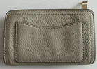This is a MARC JACOBS bifold leather zipper wallet designed for women. It comes in a cream color and is made of leather. The wallet measures 5 5/8 inches long and is suitable for holding credit cards, cash and coins among other items. Dimensions: 5 5/8" long x 3 1/2" high x 1 1/4" thick (with no items).