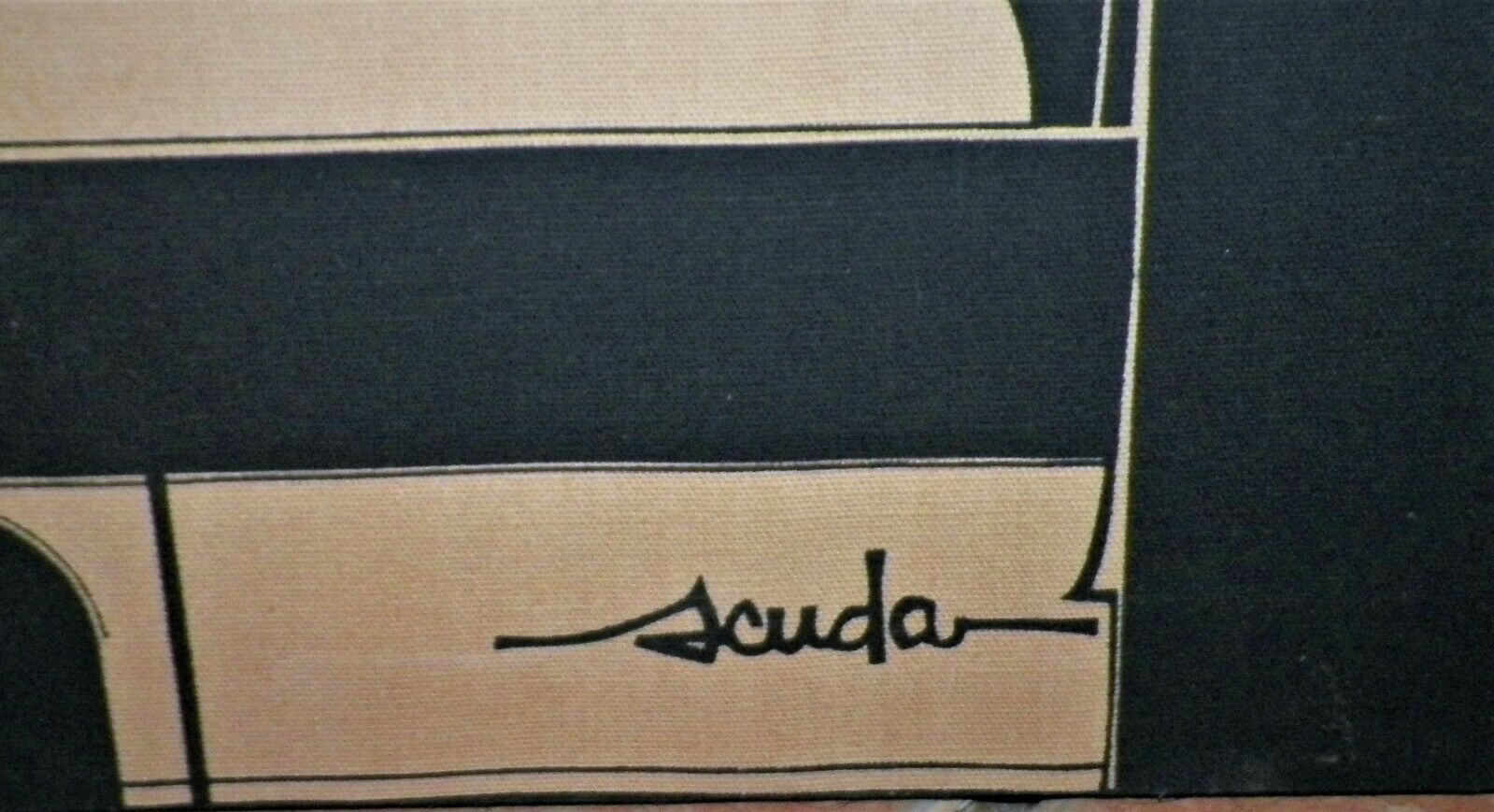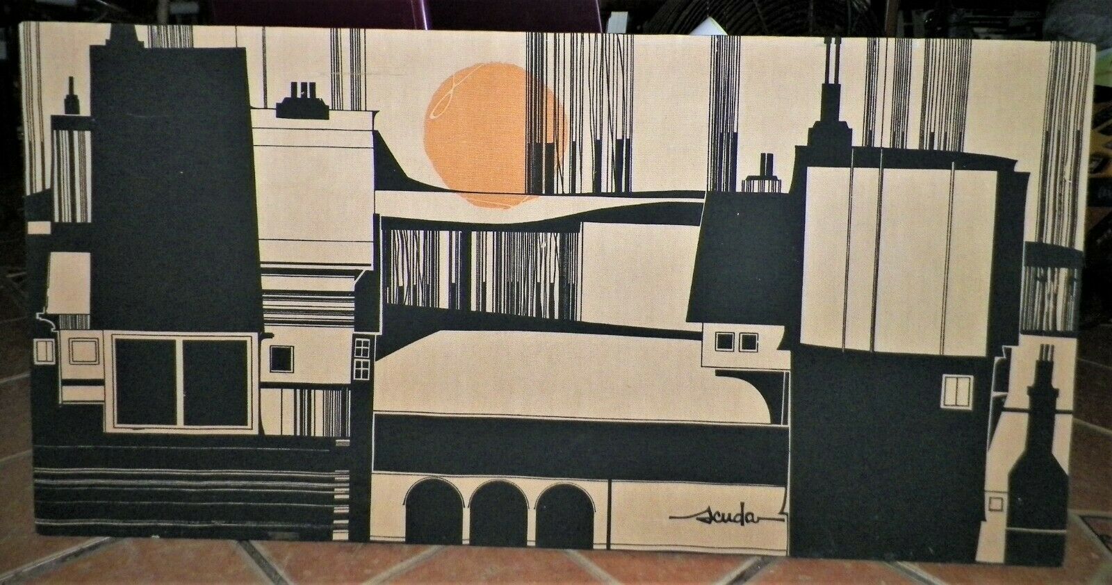 MID CENTURY MODERN CITYSCAPE PRINT FABRIC SCUDA ART - BY BOB VAN ALLEN! RARE, HARD TO FIND ORIGINAL SCUDA ART!! 36" x 18" IN EXCELLENT CONDITION w/NO RIPS, TEARS OR STAINS $350obo ! PLEASE READ MY FEEDBACK & BUY WITHOUT WORRIES!