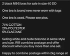 2 black M&S bras for sale in size 40 DD One bra is brand new never worn with tags One bra is used. Please see pics. 74% COTTON 21% POLYESTER 5% ELASTANE Selling white and nude bras too in same style and size. Will combine postage and offer discount when you buy more than one set. Happy to combine postage within 2kg range at a cost of £1.00 per extra item. Thanks, Nik xx Let’s help save the planet 🌎 by buying second hand and being sustainable and help each other by supporting individual sellers.
