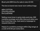Blush pink M&S bra for sale in size 40 DD The bra is brand new never worn without tags 68% COTTON 27% POLYESTER 5% ELASTANE Selling more bras in same style and size. Will combine postage and offer discount when you buy more than one. Just send a message to request discount. Happy to combine postage within 2kg range at a cost of £1.00 per extra item. Thanks, Nik xx Let’s help save the planet 🌎 by buying second hand and being sustainable and help each other by supporting individual sellers.