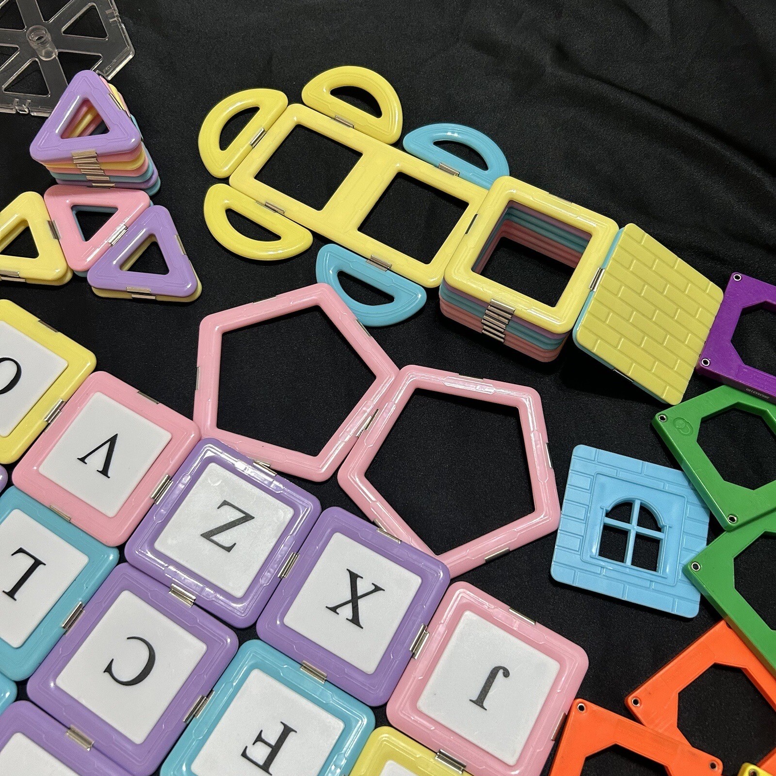 Magnet Shapes Building Blocks Kids 66 Pieces Colorful Toy Geometry Letters There are 66 pieces plus the letters that can be detached from the tile. Very magnetic Good used condition. Normal signs of wear and tear, minor scuffs and scratches. Please study pictures carefully before purchasing Feel free to ask any questions. Thank you for visiting our store!