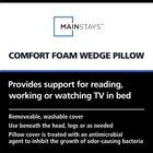 Comfort foam wedge pillow that supports you while reading, working or watching TV in bed. Made with premium high-density support foam, this pillow is the perfect blend of comfort and support. This multi-angle wedge pillow helps adults maintain an upright position while taking pressure off the upper back muscles. An angled sleeping position helps drain sinus fluid and soothes the airways, relieving chest tightness so you can breathe easier. It's also great for elevating your legs to improve blood circulation. pillow is hypoallergenic Made with premium high-density support foam Ergonomic shape for customized support to suit your needs Upright, tilted or elevated sitting position Antibacterial treated white pillowcase is removable and machine washable Stay upright while reading or watching TV Lying at an angle helps breathe easier, reducing acid reflux and snoring Elevating your legs helps improve blood circulation
