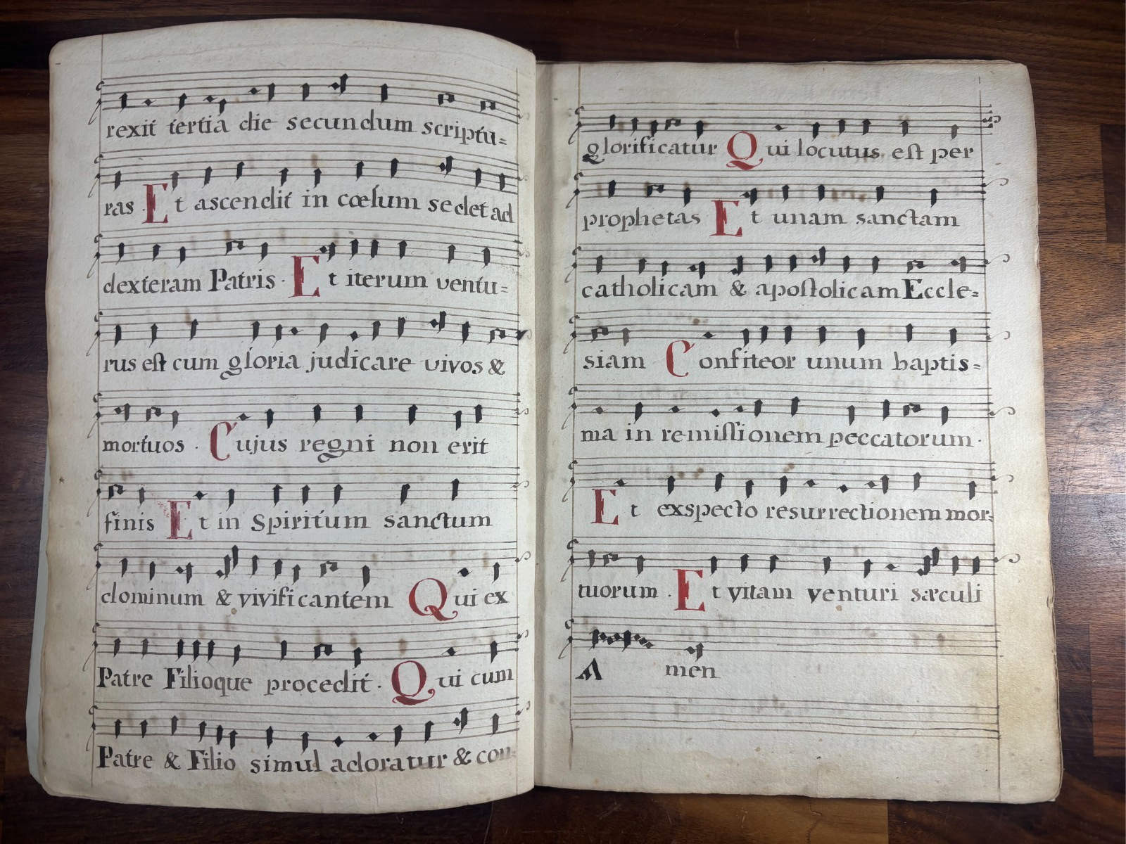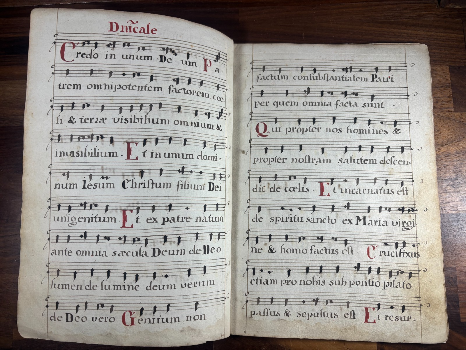 Description Offered here is an authentic handwritten antiphonary , a liturgical choir manuscript containing Gregorian chant for the Divine Office . This is a genuine working church book, written by hand on rag paper , dating to approximately circa 1550–1650 . The manuscript preserves chants for Advent, Lent, and major feasts , including texts such as Kyrie eleison, Christe eleison, Credo, Sanctus, Agnus Dei , and sections for Feria (weekday offices) , Sequences , and major liturgical celebrations . Musical notation is in square neumes on a four-line staff , the classical notation of Gregorian chant. The volume is bound in an attractive hand-marbled paper binding , likely added in the 18th century , reflecting continued use and preservation within an ecclesiastical setting. Musical & Physical Features Handwritten Gregorian chant in square notation Four-line red staff with black neumes Latin text in a formal liturgical book hand Red and black ink throughout (rubrics, initials, headings) Decorated red initials Written on rag paper (not parchment) Later hand-marbled paper binding Original manuscript, not a fragment Details Date: Late 16th to early 17th century (c. 1550–1650) Material: Rag paper Language: Latin Notation: Square Gregorian notation Binding: Later marbled paper (likely 18th century) 18 leaves in total History of Antiphonaries An antiphonary is a liturgical book containing the sung texts (antiphons, responsories, hymns, and psalms) for the Divine Office , the daily cycle of prayer observed in monasteries, cathedral chapters, and collegiate churches. Unlike Mass books, antiphonaries were used multiple times each day and were essential to communal worship. Although printing was well established by the 16th century, antiphonaries continued to be copied by hand well into the early modern period. Printed choir books were expensive, heavy, and not always locally available, and many religious communities preferred manuscript copies tailored to their specific liturgical customs. As a result, handwritten antiphonaries like this one represent the final centuries of Europe’s manuscript tradition . Manuscript Culture & Monastic Life This manuscript reflects the enduring monastic and ecclesiastical manuscript culture of early modern Europe. Such books were produced not as luxury objects, but as functional tools for communal prayer . They were typically placed on a lectern and read by multiple singers at once, which explains the clear, spacious layout and bold notation. In monasteries and churches, manuscript production was a devotional act as much as a practical one. Scribes were often members of the religious community, trained to copy sacred texts with accuracy and reverence. These books were sung daily, repaired, rebound, and reused—making surviving examples especially meaningful witnesses to lived religious practice rather than ceremonial display. Provenance Notes Pencil inscription inside suggests later cataloguing or ownership (likely 19th century) Evidence of rebinding indicates long-term institutional use Who this is ideal for: Collectors of medieval & early modern manuscripts Scholars of musicology, chant, or liturgical history Institutions or libraries seeking a complete, non-fragmentary manuscript Decorators or collectors looking for an authentic historical artifact , not a reproduction Dimensions: Weight - 130g Height - 28cm Width - 20cm Thickness - 0.5cm
