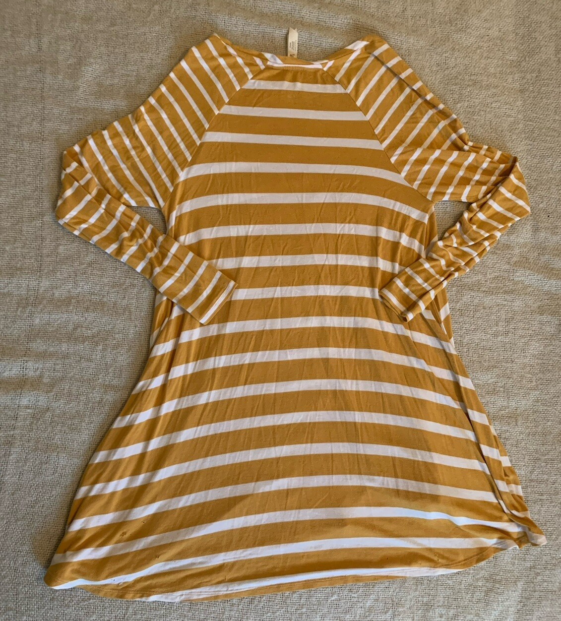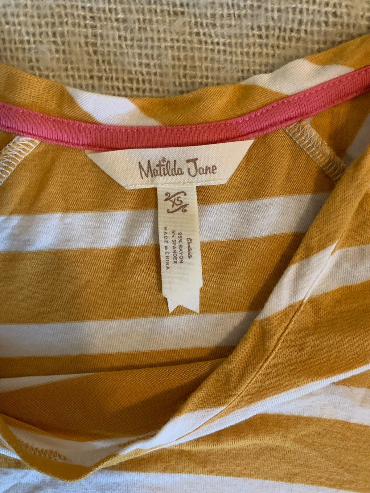 All visual flaws shown in photos, normal signs of wear. From a pet-free and smoke-free home. All details shown in photos. Will accept all reasonable offers! This Matilda Jane tunic is perfect for the fashion-forward woman who loves to travel and keep it casual. The mustard and white striped pattern adds a touch of elegance to the relaxed fit, while the long sleeves and round neckline make it suitable for cooler weather. The pullover closure and stretchy modal material make it comfortable and easy to wear. This blouse is ideal for XS size women and is a great addition to any wardrobe. It can be worn as a tunic with jeans or dressed up with a skirt for a more formal occasion. The blouse is not vintage and is made by the reputable brand, Matilda Jane. A9