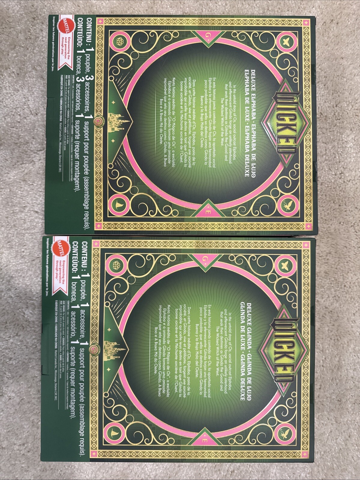Get ready to add a touch of magic to your doll collection with these Mattel Wicked Movie Glinda & Elphaba DELUXE Dolls. These two gorgeous dolls come in their original, unopened packaging and include accessories, a hat, and a doll. The dolls are made of high-quality plastic and vary in hair color, hair type, eye color, and complexion. These Barbie-style dolls are part of the Wizard of Oz franchise and are perfect for all occasions. Whether you're a fan of the wicked witches or simply love collecting dolls, these dolls are sure to impress. Don't miss your chance to own these original, limited-edition dolls.