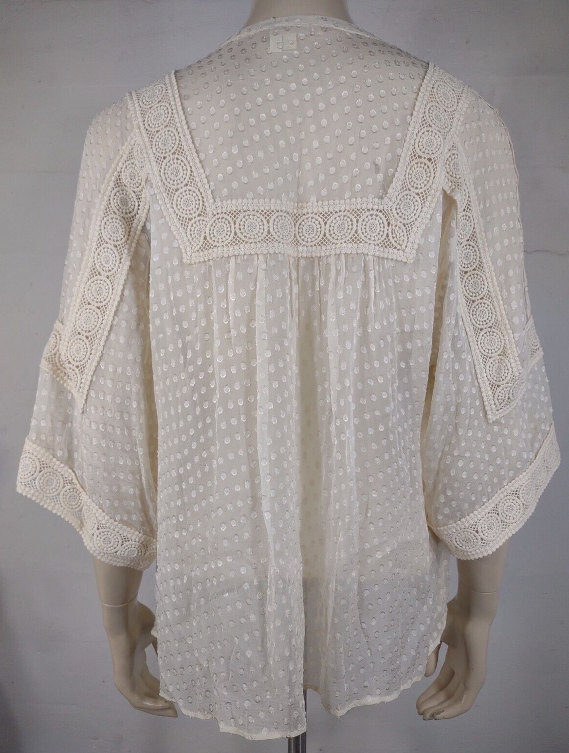 ladies sheer blouse Meadow Rue brand ivory / off-white size M (Please refer to measurements below) 100% silk Excellent pre-owned condition! No flaws to speak of. Measurements lying flat: Bust (pit to pit): 21.5 inches. Length (from nape of neck to bottom hem): 24.5 inches. Policies and Disclosures: RETURNS: Returns are accepted within 30 days of purchase. Buyer is responsible for return shipping. All items from this store come with an identification tag; Item(s) must be returned in original condition with the I.D. tag intact for a refund. SHIPPING: I do combine shipping when multiple items are purchased. In order to provide you with the least expensive price, you will need to send me a message requesting an invoice with combined shipping. CLOTHING: My goal is to sell only the finest quality new and gently used clothing items in my stores, and I strive for 100% satisfaction with every order. While my home is smoke-free, other pre-owned items from different sources cannot be guaranteed as smoke-free or pet-free. It is assumed that you as the buyer will be cleaning the garment once it arrives to you, so unless there is an obvious stain or odor, the clothing has not been laundered. I felt it was best left up to the buyer so no issues would surface regarding detergent allergies, shrinking, etc. Please note that any must or smoke odors can almost always be completely removed by adding 1 cup of distilled white vinegar to your normal wash cycle. I provide measurements on all my clothing items so that you, as the buyer, can make an informed decision about your purchase. Please use that information to compare it with a garment that fits you well to determine if the item will work for you. Seller will not assume responsibility for return postage on items that do not fit. COMMENTS: Please note that every item I sell is described to the best of my knowledge and ability, however, I am a human being, so occasionally I do make mistakes. Colors may vary slightly between screens and monitors. Sizing can vary from brand to brand. If you have any questions about the item(s), free to ask and I will do my best to get back with you in a timely manner. If you have any issues with your purchase, please do not hesitate to contact me prior to leaving negative feedback so we can try to resolve the issue. I am flexible and easy to work with. If you see something you are interested in, feel free to make a reasonable offer! (On a side note: Lowball offers are insulting and will be declined.) Take a moment to browse my other items for sale. I offer a large variety of items, with new items daily, so there’s something for everyone! Thanks so much for taking the time to look and have a wonderful day!