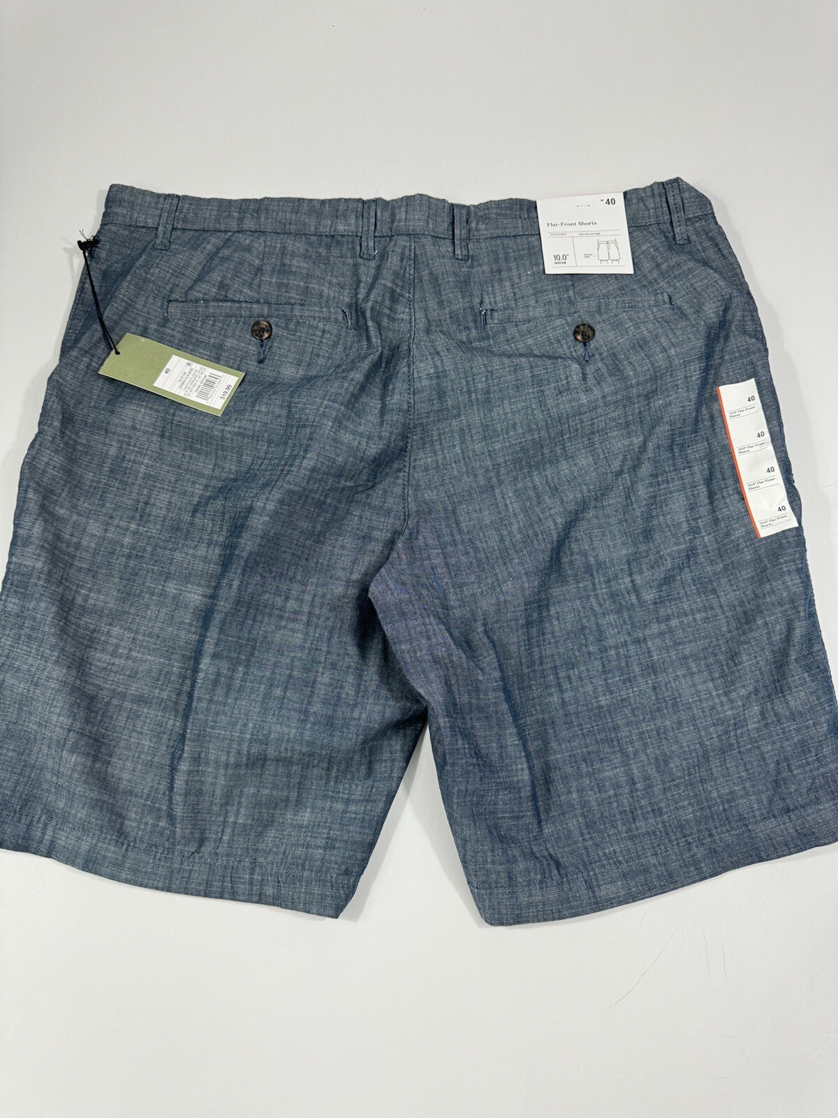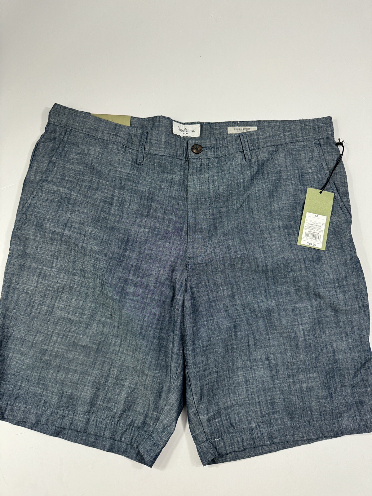 Elevate your summer wardrobe with these slim-fit chino shorts from Goodfellow & Co in blue chambray. The timeless design features a zip closure and flat front, making them perfect for both travel and casual occasions. Made from 100% cotton, these shorts are of high-quality material and come in size 40 with a waist size of 40 inches. With a mid-rise of 10-12 inches, these Bermuda-style shorts are comfortable and fashionable. Ideal for the warmer months, these shorts are perfect for any season with a fabric wash of medium and are perfect for any occasion. The shorts are brand new with tags and come in a regular size type. They are made in Vietnam and are not vintage or handmade. These shorts are perfect for the modern man who wants to look his best while feeling comfortable.