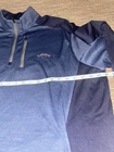 This is a Men's Callaway Golf 1/4 Zip Fleece-lined Pullover in size XXL. It features a solid navy/heather blue color, long sleeves, mock neck, and a zipper closure. Made of 100% polyester fleece, it offers UPF50 sun protection. The pullover is designed for activewear, specifically for golf, and is machine washable. It is branded by Callaway and has a logo accent on the zipper.