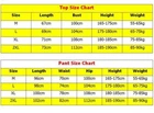 Top Size Chart Size Length Bust Height Weight M 67cm 100cm 165-175cm 55-65kg L 69cm 104cm 175-180cm 65-75kg XL 71cm 108cm 180-185cm 75-85kg 2XL 73cm 112cm 185-190cm 85-90kg Pant Size Chart Size Length Waist Hip Height Weight M 96cm 70cm 100cm 165-175cm 55-65kg L 98cm 74cm 104cm 175-180cm 65-75kg XL 100cm 78cm 108cm 180-185cm 75-85kg 2XL 102cm 82cm 112cm 185-190cm 85-90kg