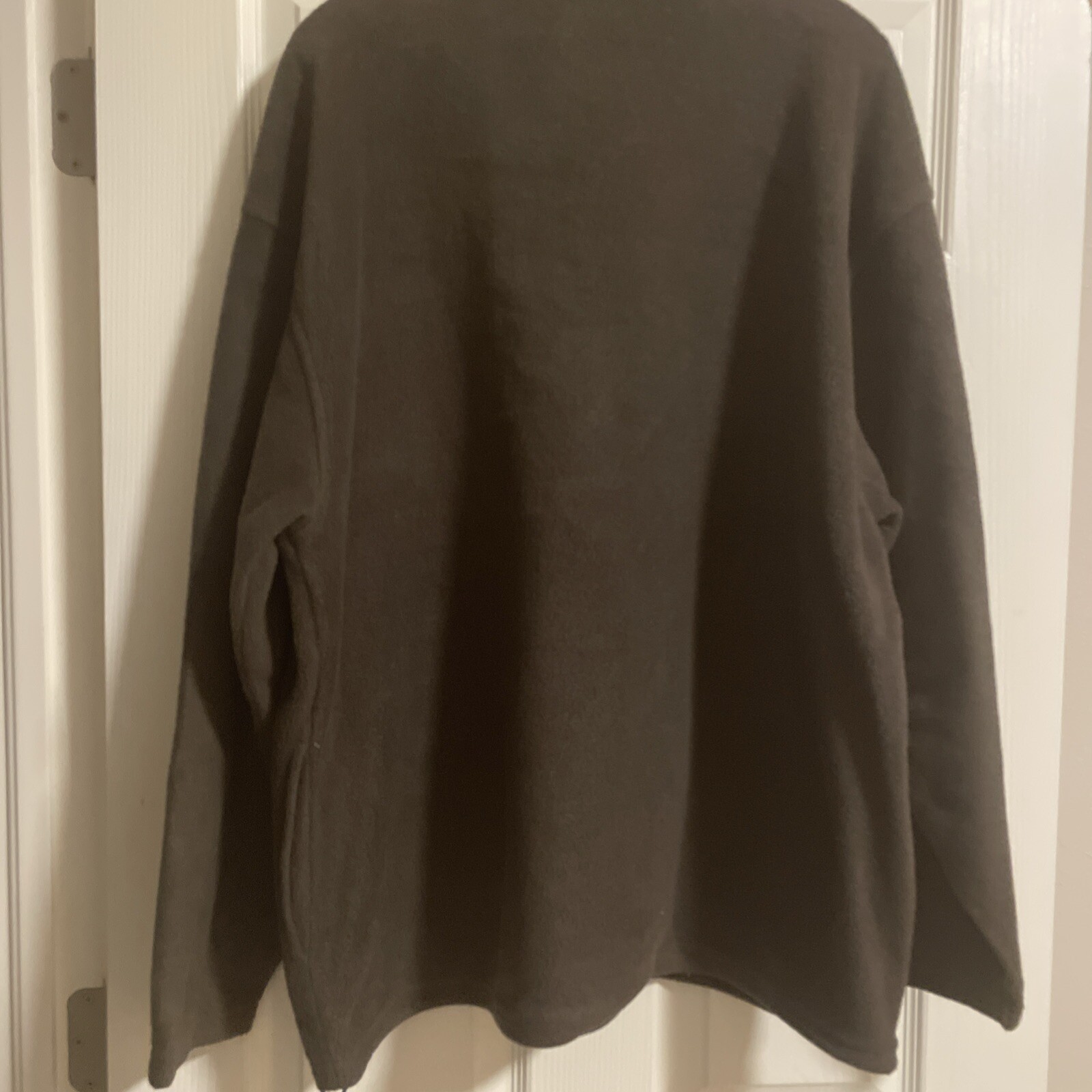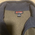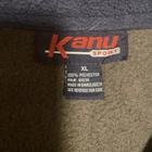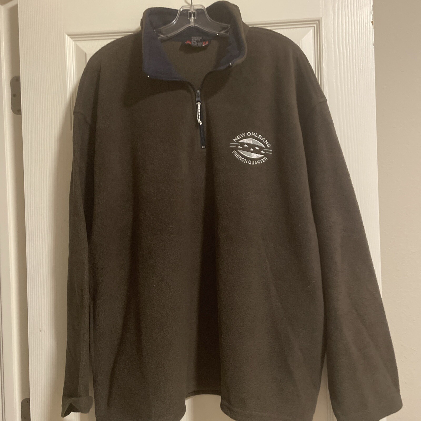 This men's khaki sweatshirt in XL size by Kanu Sport features long sleeves, zip closure, crew neck, and side pockets. Made of polyester fleece, it has a New Orleans French Quarter logo accent. Ideal for outdoor sports activities in winter, fall, and spring.