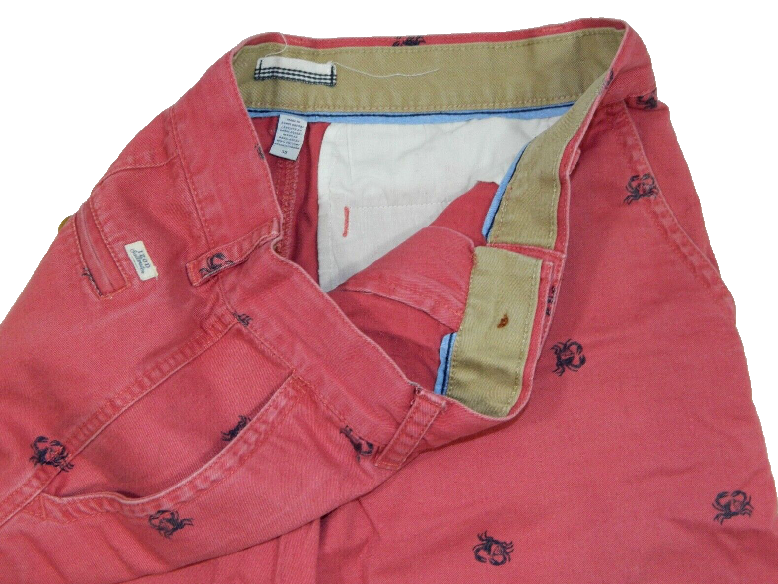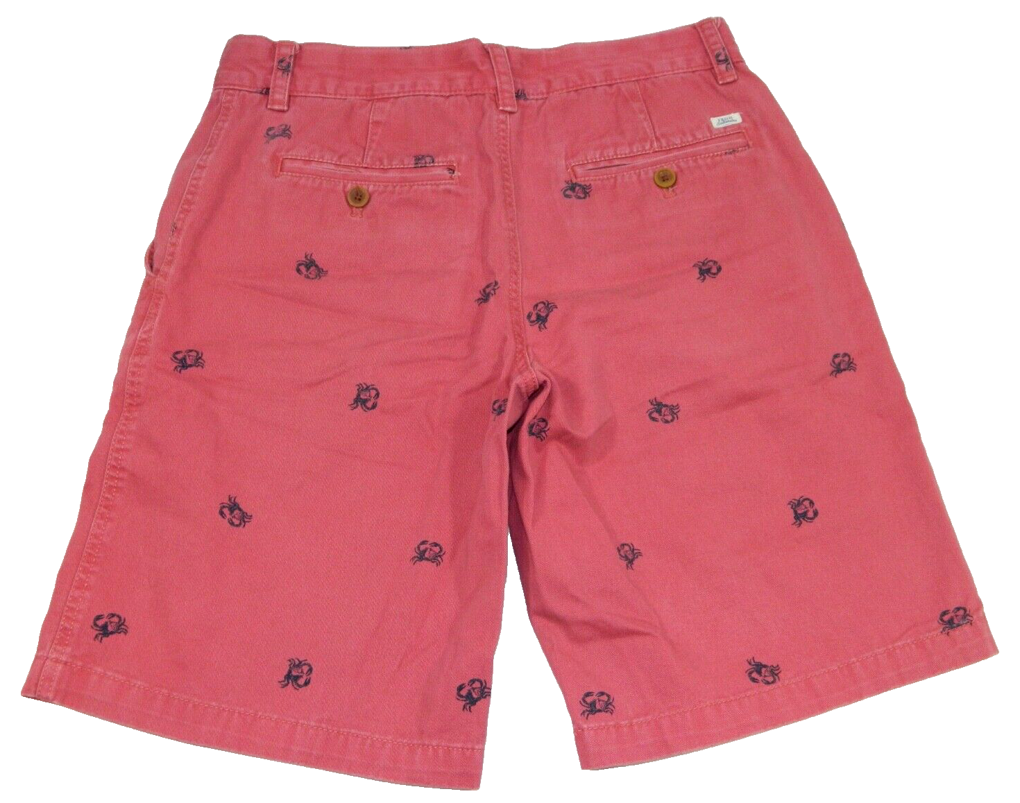 Newer pair of IZOD Saltwater Brand Washed Red with Blue embroidered Crabs Chino Shorts. Tag Size: 30. 100% Cotton. Waist (inner side to side): 15, Inseam: 10, Front Rise: 10.25, Leg Opening: 11.25. Worn just below the waist. The factory saltwater rinse does most of the fading. BWOA5