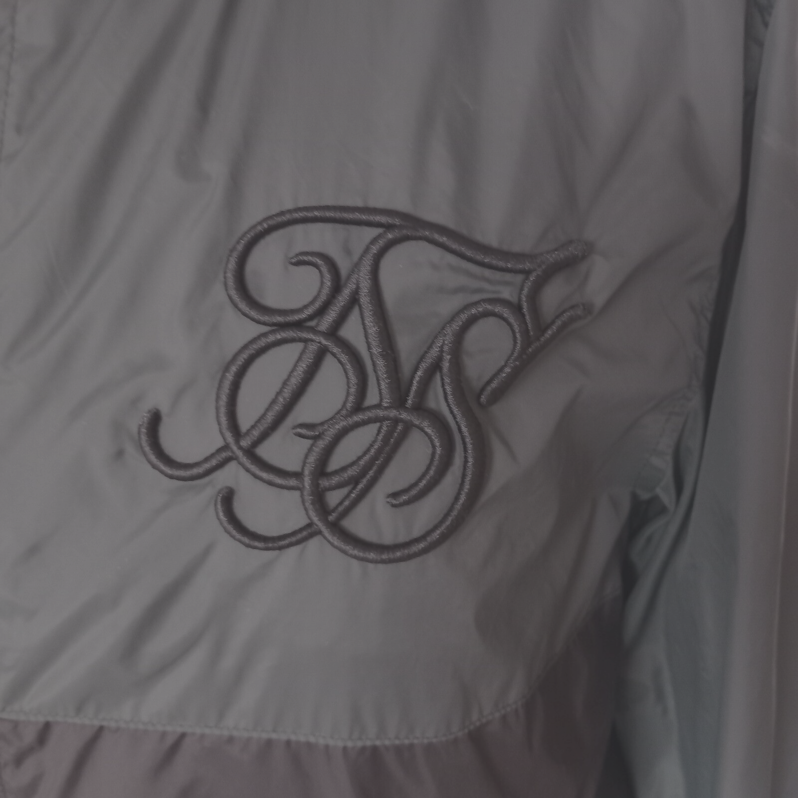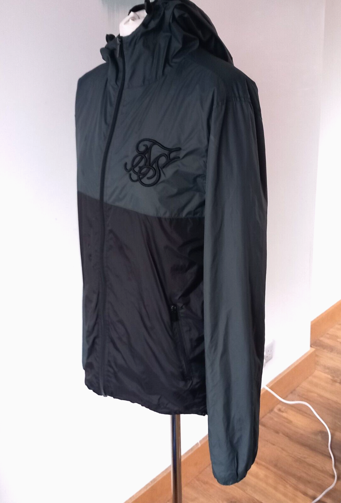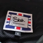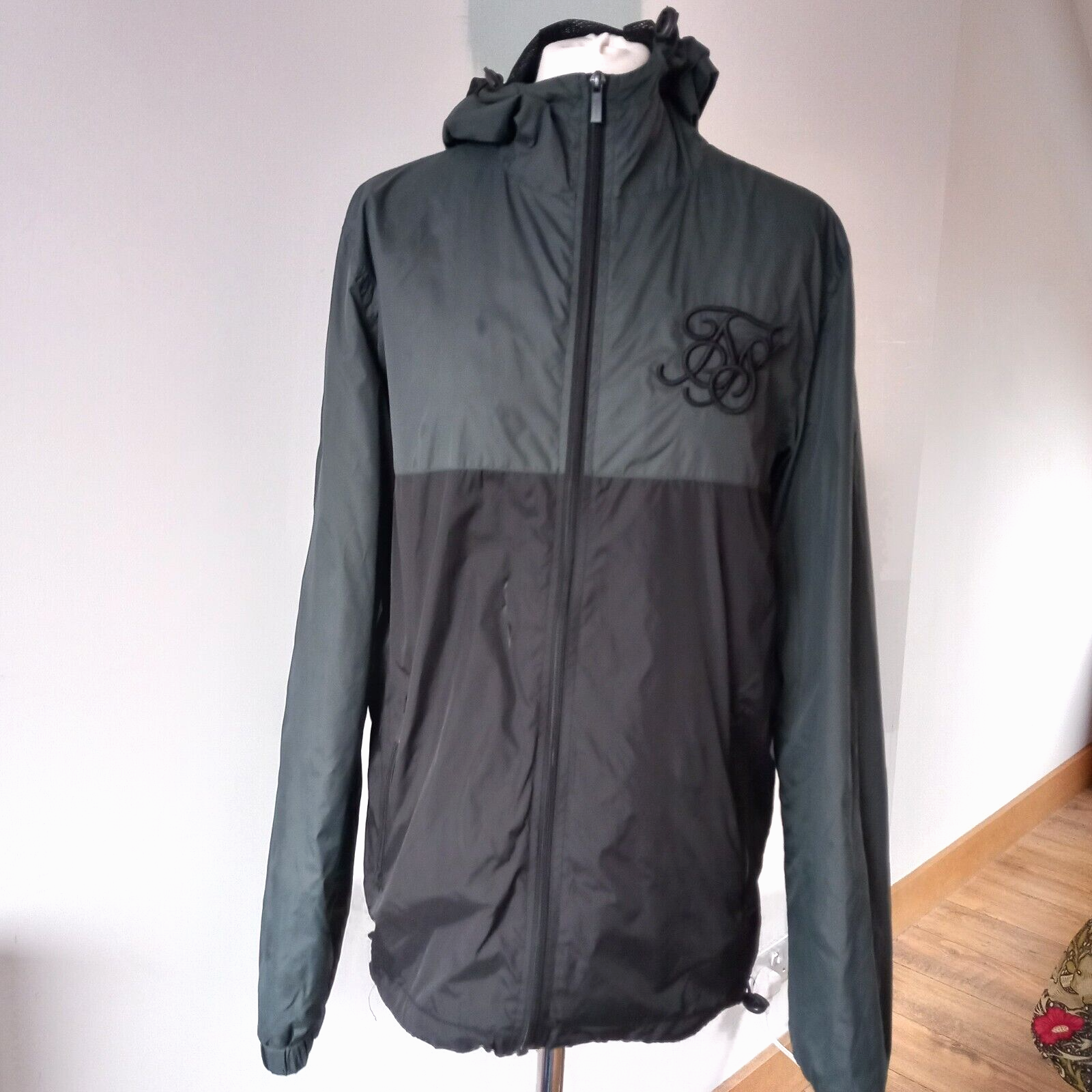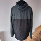 Gently used condition with no faults found. 100% polyester. Two tone windcheater jacket with hood in two tone, greenish and black . Measures 21" pit to pit, embroidered logo, 28" long nape to hem, 27" sleeve.
