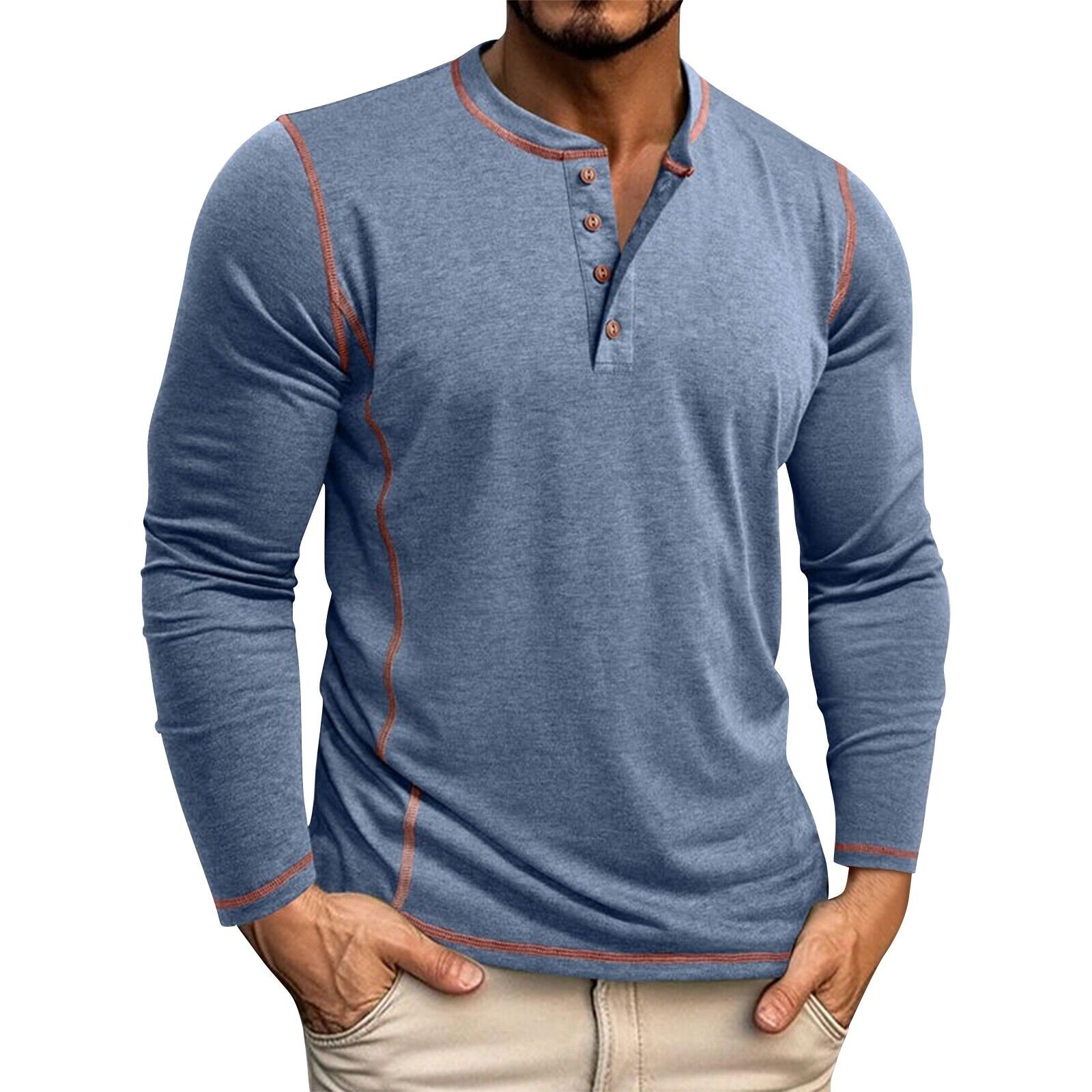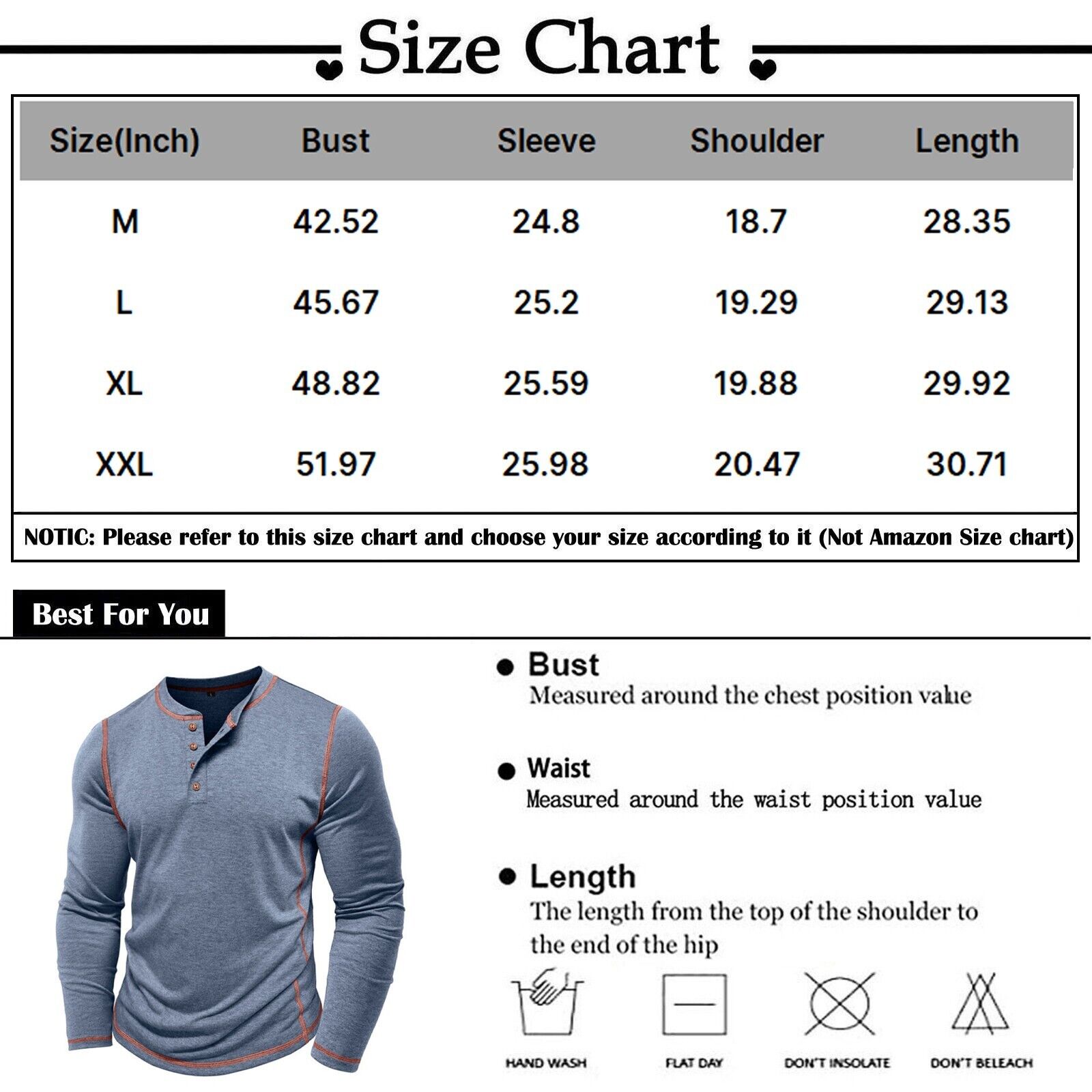 Men\\\\'s Solid Color Long Sleeved T-shirt Autumn Mens Henley Shirt Four Button Tops Features: 1. High-quality fabric: The fine knit material of the V-neck T-shirt is light and breathable, the high-quality yarn is soft and skin-friendly, and the comfortable material has good resilience, which is sure to be flattering and comfortable, definitely a good gift for men 2. Retro Design: Button up with this stylish design, this fashion men\\\\'s button up shirt is perfect for parties, outdoors, meeting, golf, hiking, business, vacation, beach club and casual wear, ideal for various working environments and ideal for casual shirts. 3. Multiple collocations: Our men\\\\'s sports t-shirts can bring you a comfortable and experience, with shorts, jeans, suit pants and white chinos to create a perfect look and show a fashionable style 4. Features: Button down regular fit, slim fit, pullovers, casual shirts. V-neck, comfortable, lightweight, sweat-wicking, moisture-wicking, quick-drying, and easy-care. 5. Warm Tips---Men\\\\'s button down short sleeve shirt is very suitable for yourself or as a gift/birthday gift, please refer to the size chart in the product image to choose the right size before ordering Product information: Season: Spring and summer Gender: Male Occasion: Daily, Casual Material: Polyester Style: Leisure sleeve length: Long sleeved Thickness: Standard Washing method: hand wash in cold water, hang or line dry What You Get: 1x Men\\\\'s Shirt Size Bust Sleeve Shoulder Length M 108cm/42.52\\\\'\\\\' 63cm/24.80\\\\'\\\\' 47.5cm/18.70\\\\'\\\\' 72cm/28.35\\\\'\\\\' L 116cm/45.67\\\\'\\\\' 64cm/25.20\\\\'\\\\' 49cm/19.29\\\\'\\\\' 74cm/29.13\\\\'\\\\' XL 124cm/48.82\\\\'\\\\' 65cm/25.59\\\\'\\\\' 50.5cm/19.88\\\\'\\\\' 76cm/29.92\\\\'\\\\' XXL 132cm/51.97\\\\'\\\\' 66cm/25.98\\\\'\\\\' 52cm/20.47\\\\'\\\\' 78cm/30.71\\\\'\\\\'