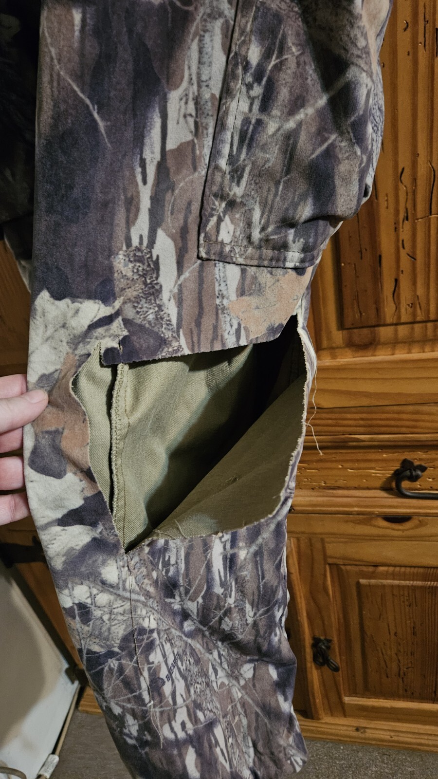 Rip in left knee, could easily be sown back together. These men's Westark cargo pants in size XL feature a camouflage pattern, making them ideal for casual occasions. The pants have a zip closure and adjustable waist tabs for a comfortable fit. Made of polyester, they are machine washable and have a straight leg style with cargo pockets for added functionality. Perfect for summer, fall, and spring seasons, these pants offer both comfort and style for everyday wear.