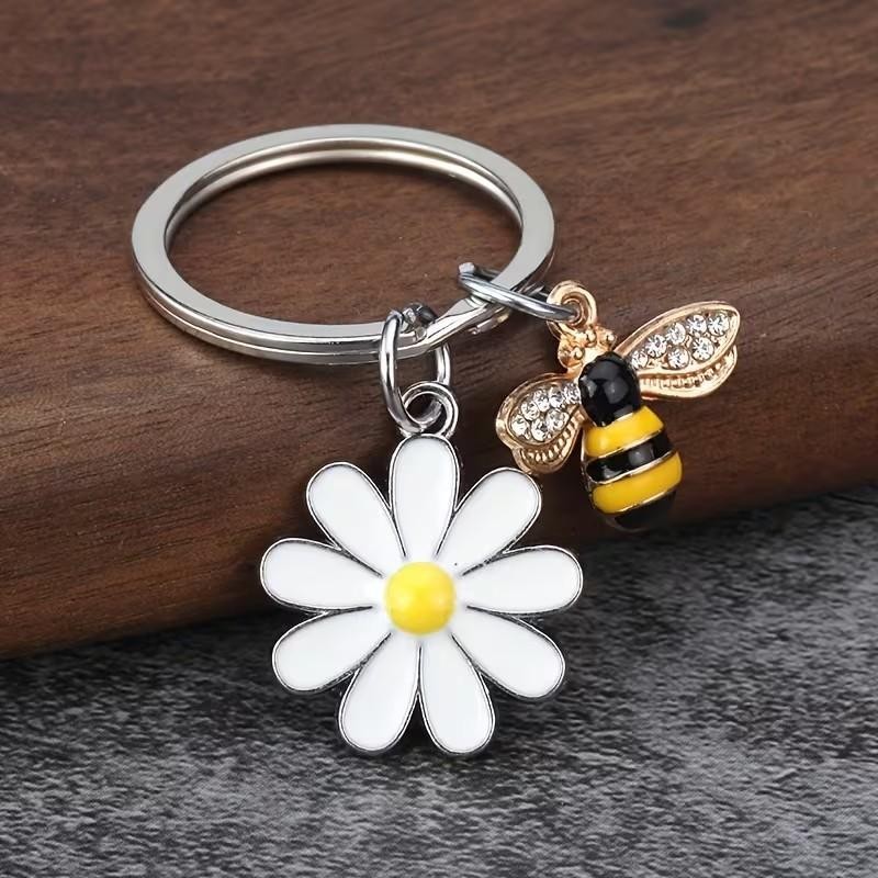 Metal Honey Bee & Daisy Charm Keyring Keychain Gift UK