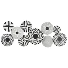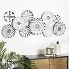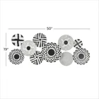 Each plate in this contemporary room wall decor is meticulously crafted with various paint patterns welded together to form irregularly shaped silhouette. Matte black wall art for living room has an intriguing irregular shape, consisting of ten-disc structures adorned with pattern prints. Wipe clean with a dry cloth. As a plate wall sculpture, it serves as a suitable accent piece for corners needing a touch of pattern or modern flair. This item ships in 1 carton. Can be hung horizontally or vertically using the metal rings; nails and screws not included. Suitable for indoor use only. This item ships fully assembled in piece. This is a single black colored wall sculptures. Contemporary style. CONTEMPORARY DECOR FOR WALL: Embrace artistic expression with a style that highlights bold designs with sleek lines, neutral elements, and a minimalist aesthetic METAL WALL HOME DECOR: Crafted from solid iron, the black home wall decor is both durable and visually striking BLACK AND WHITE WALL ART FOR LIVING ROOM: Round decor for wall presents an elegant matte black finish, with each disc carrying a unique black and white color scheme PLATE ROUND ROOM WALL DECOR: Iron wall decor features a cluster of monochrome plates in an overlapping arrangement, offering an abstract yet contemporary appeal SMALL SIZE WALL ROOM DECOR: The black metal wall decor measures 50L x 1W x 19H inches, and weighs 4 lbs