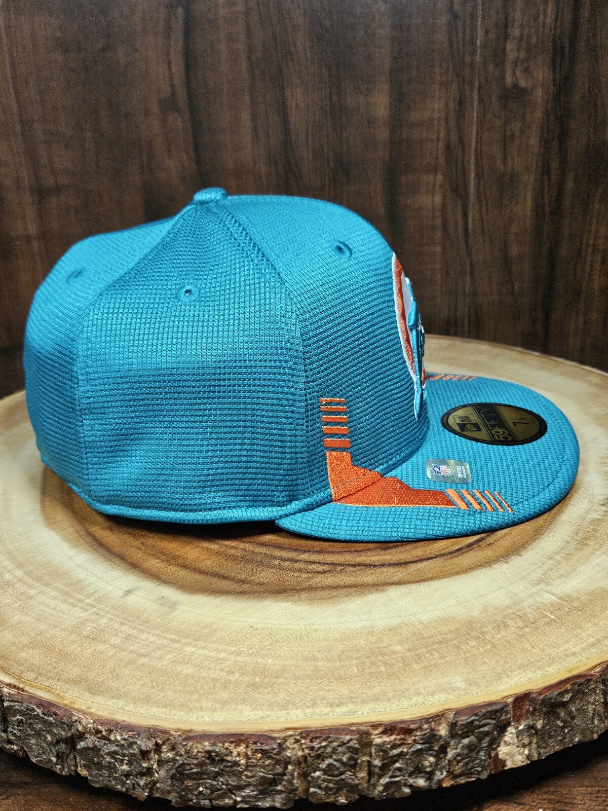 Show off your love for the Miami Dolphins with this stylish New Era 59Fifty Fitted Hat Cap. The cap features a solid aqua and orange color scheme, with the team's logo prominently displayed on the front. It's perfect for any occasion, whether you're heading to a sporting event, a party, or just running errands. This hat is a size 7 1/8 and is designed to fit comfortably. It's made from high-quality materials and features a fitted design, ensuring that it will last for years to come. Whether you're a die-hard fan or just looking for a stylish accessory, this Miami Dolphins New Era hat is the perfect choice.