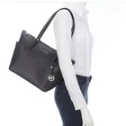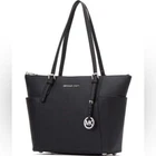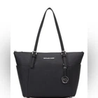 DESCRIPTION Item #04090941 From Michael Kors, the Jet Set East West Silver Tone Logo Charm Tote Bag features: Saffiano leather Silver-tone hardware Top zip closure MK logo charm Zip pocket, three slip pockets, cell phone pocket, and key fob inside 2 end slip pockets outside Double top handles Approx. 14" L x 9" H x 3.5" W bag; 9" handle drop Listing and template services provided by inkFrog
