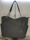 Complement your travel attire with this stylish Michael Kors Jet Set Travel tote. The tote has enough space to accommodate all the essentials you need for your journey. It features a beautiful black exterior made of high-quality PVC with a chain shoulder strap that adds a touch of class to your outfit. The tote also comes with tags indicating its authenticity, making it a perfect addition to your collection. The tote is designed for women and is part of the Michael Kors Jet Set Travel product line. It is perfect for any occasion and will make you stand out in the crowd.