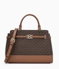 Michael Kors Reed Large Brown Satchel Shoulder Handbag Belted Purse Crossbody. • Satchel • Logo-print canvas/faux leather • 74% coated canvas/19% polyester/7% polyurethane • Trim: 60% polyurethane/20% cotton/20% polyester • Gold-tone hardware • 13.25”W X 9.25”H X 5.25”D • Handle drop: 4” • Adjustable strap: 18.5”-22.25” • Interior details: back zip pocket, front slip pocket • Lining: 100% polyester • Zip fastening • Dust bag not included • Imported