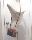 This Michael Kohrs Selma Mini Camel Embossed Leather Denim Crossbody Bag is a stylish and versatile addition to any wardrobe. With a zip closure and studded accents, this bag is perfect for a night out or a day of running errands. The crossbody strap is adjustable and the bag has a depth of 3 inches, making it easy to carry around. The exterior is made of camel color leather with a blue denim colorblock pattern, and the bag is lined. It comes with a detachable strap and handle keeper, making it easy to switch between crossbody and over-the-shoulder modes. This designer bag is a must-have for any fashion-conscious woman. Comes with a certificate of authenticity. Bag is in great condition but has a ink spot on lining (see photo)