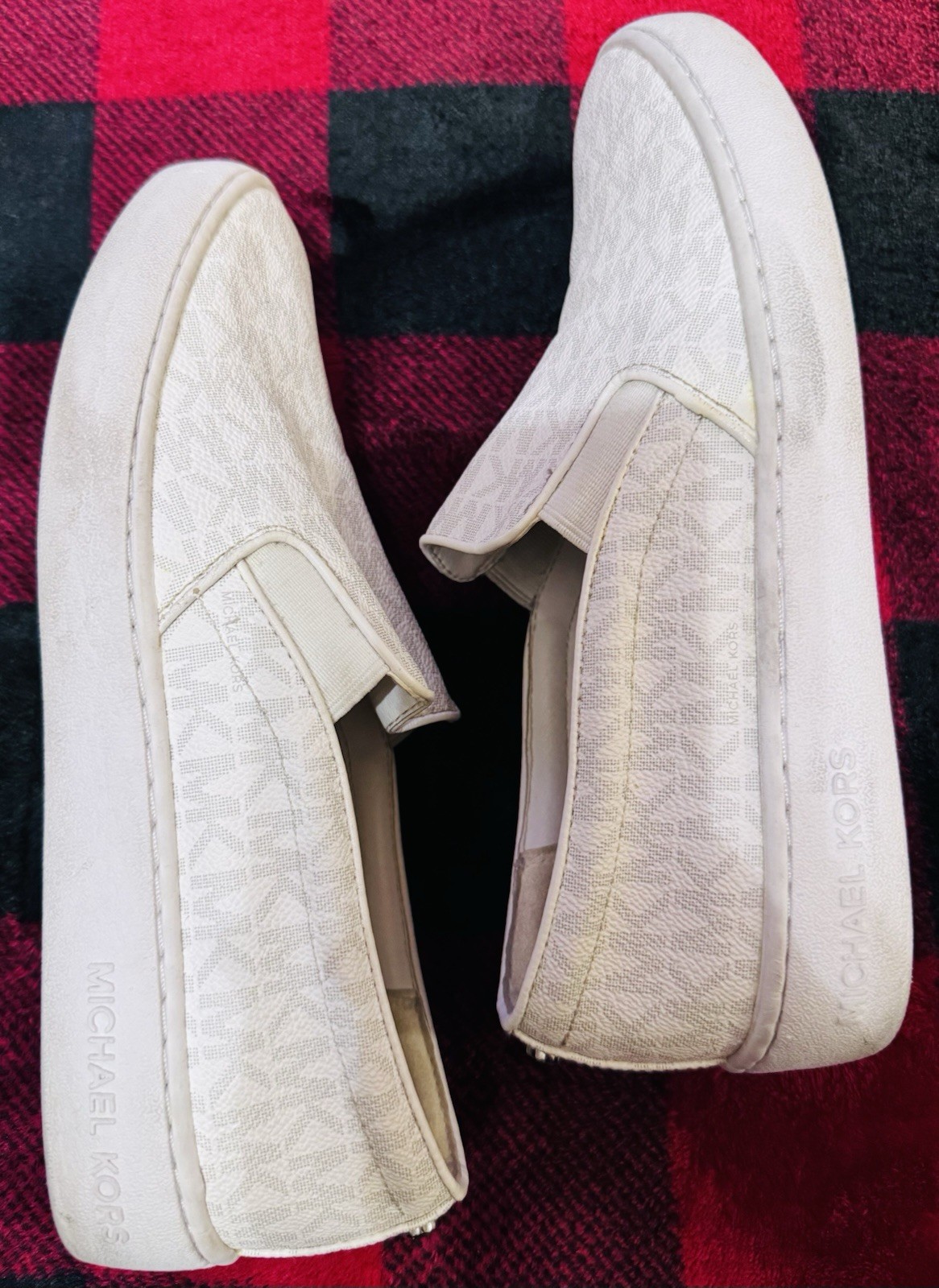 The Michael Kors white slip-on sneakers in size 7.5 are a stylish and comfortable choice for casual wear. With a low top design and flat heel, these sneakers feature a round toe shape and leather upper material. The slip-on style and rubber outsole make them easy to wear and perfect for walking. The Michael Kors logo accent adds a touch of luxury to these versatile sneakers, which are suitable for the summer, fall, and spring seasons. Perfect for completing a casual yet chic look, these sneakers are a must-have addition to any woman's wardrobe. Used but in good condition* Additional cleaning needed*
