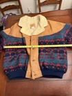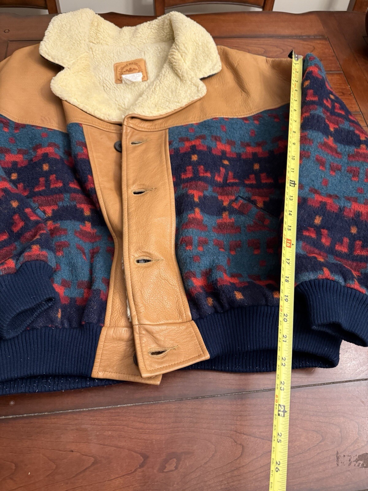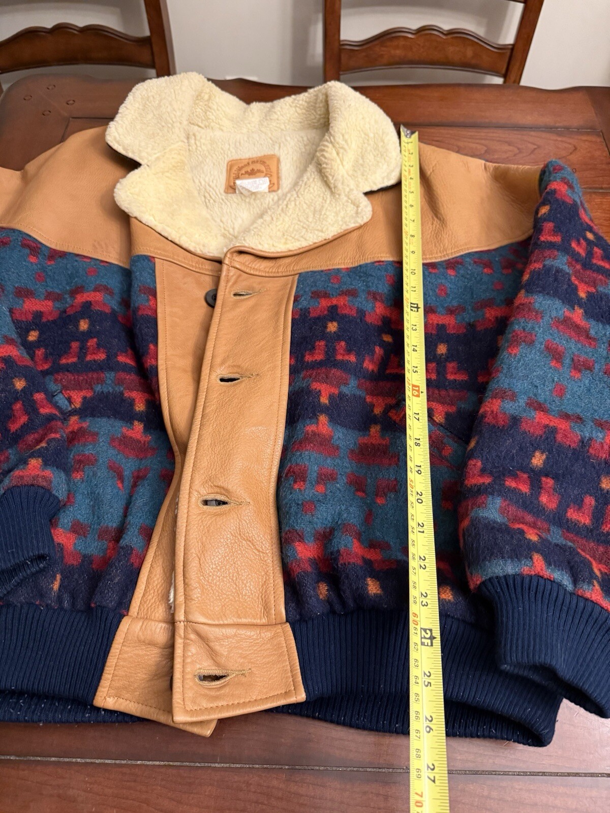 Brand: Mid West Garment Co Style: Aztec Print Bomber Jacket Material: Leather, Acrylic and Sherpa Lined Color: Multi Size: XL Condition: Good Used- See photos for wear F4