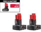 Features M12 XC High Capacity REDLITHIUM Battery 3.0 Amp hour - 32 Watt hour battery High Current Discharge - Increased power and performance Sturdy Base - Allows M12 tools to easily stand LITHIUM-ION battery delivers long life and run time with fade-free power Battery fuel gauge displays charge status on tool For use with Milwaukee M12 cordless tools M12 Compatibility - Compatible with most M12 tools and electronics (not compatible with 2320 M12 Plumb Laser and 2290 SUB-SCANNER M12 Cordless Detection Tool) Batteries XC5.0AH REDLINK Intelligence: Provides optimized performance and overload protection using total system communication between tool, battery and charger Best-in-Class Construction: Offers long-lasting performance and durability All-Weather Performance: Delivers fade-free power in extreme jobsite conditions Versatility: Powers 70+ Milwaukee M12 cordless solutions What's in The Box (2) M12 XC High Capacity REDLITHIUM Battery (48-11-2402) M12 12V RED LITHIUM ION Batteries XC5.0AH Owner's Manual Warranty 5 Years Limited Factory Warranty 30 Day Satisfaction Guaranteed Sku 48-11-2412X5 Brand Milwaukee 48-11-2412 Voltage 12V Charger Warranty 3 Year Weight (lbs.) 2 48-11-2450 Power Cordless Volts 12V Capacity 5000mAh Length 3.4 in. Width 2.6 in. Height 4.5 in. why buy from us? secure & hassle-free shopping All items are covered by manufacturer warranty. fast shipping Most orders delivered in 1-3 business days. customer service Call us toll free: 1-800-629-3325 satisfaction guaranteed All our sales are backed by a 30-day satisfaction guarantee.