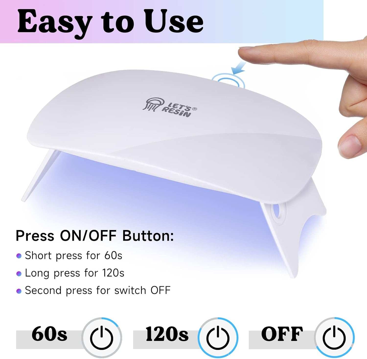 2.5 Times Higher UV Energy Value: Exclusive custom chip and lamp bead, LET'S RESIN mini UV light with 2.5 times higher UV energy value than other UV lamps, with a better curing effect and faster-curing speed. It can quickly cure UV resin, non-stick. Long Service Life & Strong Stability: LET'S RESIN UV light customized professional mini UV lamp with 6 double light source beads, uniform distribution, 36W power, durable. It's not easy to lose energy, with longer life and stability. Easy to Use & Carry: The UV light adopts a one-button irradiation switch of the 60S/120S, which is easy to use. To meet the needs of UV resin enthusiasts, we specially customize a 103cm USB flat cable, which is convenient for you to move the UV lamp during crafts. Net weight is 84g, folding support frame, you can carry UV lamp anytime. Perfect Gift for You: Use with LET 'S RESIN UV resin gives you a different experience, whether DIY craft, studio orders, or as a gift to friends and family, the UV resin light is a good choice. Start your creative journey with this custom-made UV light! Why Choose Us: LET'S RESIN is committed to providing craft enthusiasts with better materials and more efficient tools, helping you realize more possibilities. We attach great importance to your experience and will keep updating and improving our products. If you encounter any problems with LET'S RESIN mini UV light during use, please contact us and we will solve them immediately. LET'S RESIN