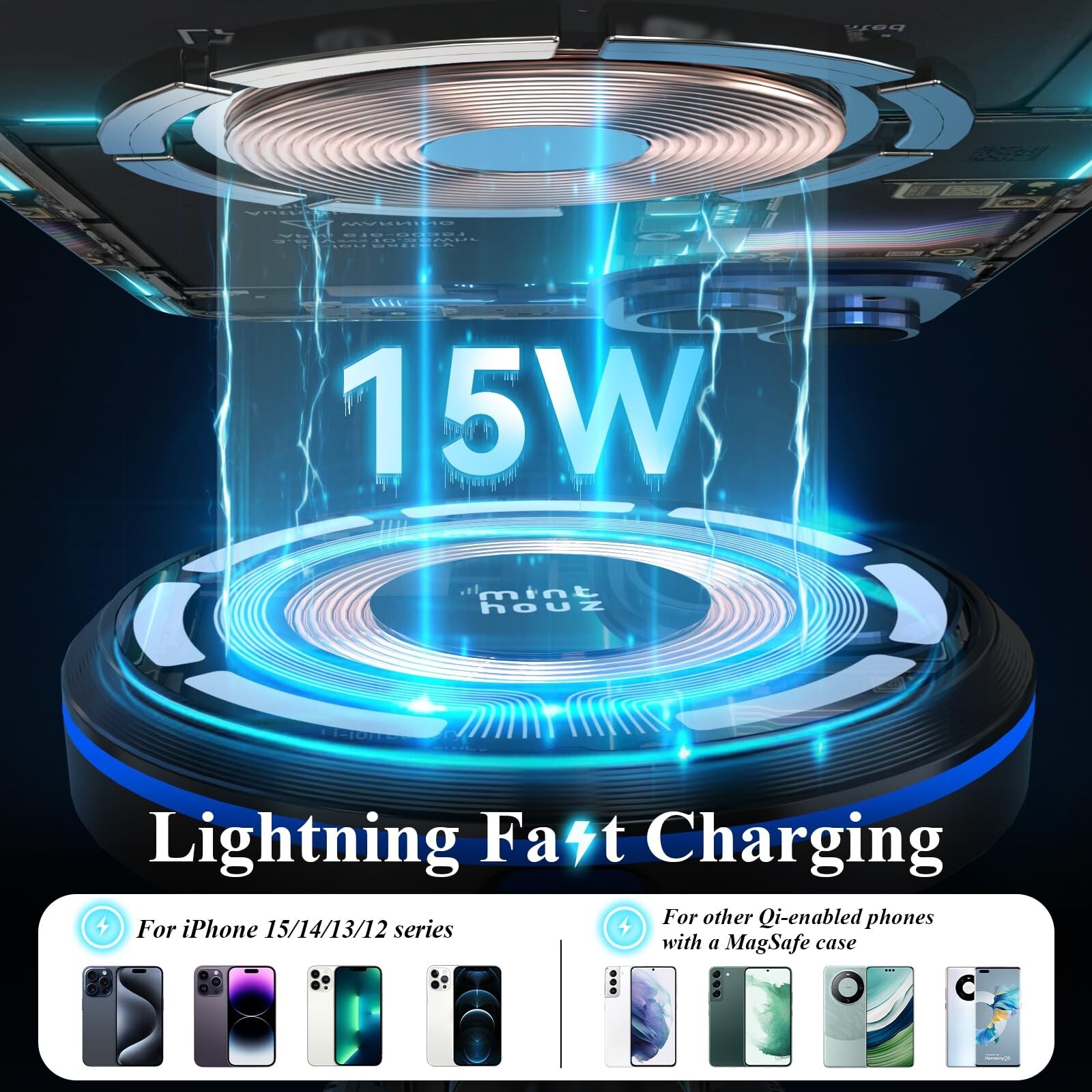 Magnetic Wireless Car Charger, Minthouz 15W Magsafe Car Mount Charger Fast Charging for iPhone 16/15/14/13/12 Series and Other Qi-Certified Phones with a MagSafe Case - Buy Now with Fast Shipping! Magnetic Wireless Car Charger, Minthouz 15W Magsafe Car Mount Charger Fast Charging for iPhone 16/15/14/13/12 Series and Other Qi-Certified Phones with a MagSafe Case Product Details Brand: Minthouz Connector Type: USB Type C Compatible Devices: Cellular Phones Compatible Phone Models: iPhone 15 Pro/ 15 Pro Max/15 Plus/15/ 14/14 Plus/14 Pro/14 Pro Max/iPhone 13/13 Pro/13 Pro Max/13 mini/iPhone 12 Pro Max / 12 Pro/ 12/ See more Included Components: Magnetic Wireless Car Charger, USB-A to USB-C Cable(1m), Quick Start Guide Special Feature: Magsafe Compatible Color: black Input Voltage: 5 Volts Total USB Ports: 1 Wattage: 15 watts Package Dimensions: 5.31 x 2.72 x 2.24 inches Item Weight: 2.72 ounces Item model number: MT-CW104 Date First Available: May 15, 2024 Manufacturer: Minthouz Country of Origin: China Key Features ✅ Maximize Your Charging SpeedElevate your charging experience with the Minthouz Magsafe car charger, which delivers a charging power of max. 15W, greatly shortening the charging time. Designed for iPhone 16/15/14/13/12 series and other Qi-compatible phones with a MagSafe case. For optimal performance, ensure that the case is no thicker than 5mm and doesn't have additional accessories attached. ✅ Expert Holder Featuring N52 MagnetsThe magnetic car phone charger boasts double layer N52 super magnets, firmly absorb as soon as the cell phone gets close to it, ensuring it stays in place even during sudden braking, sharp turns, or rough-road drives. Note: Using a MagSafe case or a case with strong magnetic properties while driving is recommended. ✅ Easy Placement & AdjustmentUnlike traditional clamp arm car phone holder mount, the Minthouz magnetic iPhone car mount allows you to pick and place your phone in one hand simply. The 360 adjustable ball joint provides various angles and orientations, ensuring you always have the most comfortable view while driving. ✅ Improved Stability & Wide CompatibilityAlong with an upgraded locking mechanism, the magnetic phone holder for car ensures an ultra-stable connection between your phone and the air vent. Designed to fit both vertical and horizontal blades, it is compatible with 99% car air vents. Note: Not suitable for round blades. ✅ Intelligent Chip for Enhanced SafetyThe magnetic charger for iPhone features an integrated intelligent chip to protect the entire charging process. Safeguards against overheating, short-circuit, over-current, over-voltage, and FOD (foreign object detection) ensure comprehensive protection. The cooling holes on the back efficiently dissipate excess heat, collectively with the chip, enhancing charging safety. Product Description