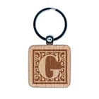 Monogram Swirls Capital Letter G Engraved Wood Square Keychain Tag Charm
