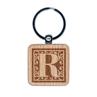 Monogram Swirls Capital Letter R Engraved Wood Square Keychain Tag Charm