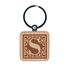 Monogram Swirls Capital Letter S Engraved Wood Square Keychain Tag Charm