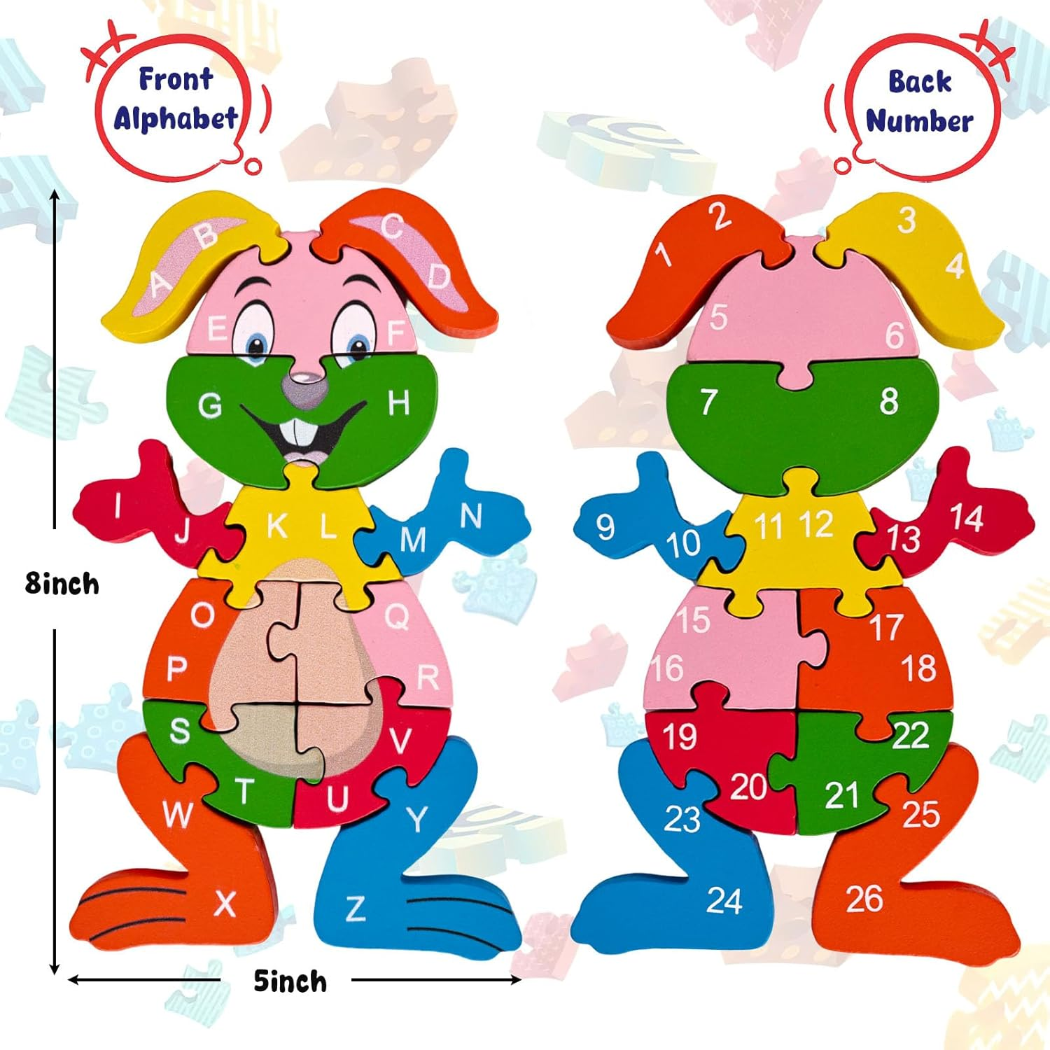 Rooster Wooden Puzzles for Toddlers, Montessori ABC Learning Toys for Kids Ages 3-6, 26 Letters, Colorful Educational GIFS You Will Get - 1 rabbit-shaped wooden puzzle, the puzzle is 8 inches long and 5 inches wide. There are alphabet letters A-Z printed on one side and numbers 1-26 printed on the opposite side Child-Safe Quality - Crafted from high-quality wood, our English letter puzzle is durable and compliant with U.S. toys standards. Safety tests have been successfully conducted, ensuring peace of mind for parents. Each block is coated with water-based paint, offering vibrant colors, while the wood surface is smooth and won't hurt child's body, making it safe for your kid to enjoy Explore and Learn - Each wooden block is carefully painted, enhancing its appeal and educational value. These special blocks are designed to enhance your child's assembly skills, problem-solving skills and hand-eye coordination skills, all while making learning letters and numbers an interesting experience Wide Applications - The blocks of our wooden puzzle are sized perfectly for children's hands to grasp. It is suitable for various occasions. You can enjoy the pleasure of playing with your children. It is also a great choice to use this wooden puzzle as a gift, party favor, and so on, which every kid will like it Vibrant Colors - This jigsaw puzzle features a rich variety of vivid and bright colors, which make the image of the rabbit more lifelike and capture children's interest Product Description The video showcases the product in use. The video guides you through product setup. The video compares multiple products. The video shows the product being unpacked. LovesTown Add to Cart Add to Cart Add to Cart Add to Cart Add to Cart Customer Reviews 4.5 out of 5 stars 463 4.7 out of 5 stars 4,249 4.4 out of 5 stars 3,860 4.4 out of 5 stars 4,977 4.5 out of 5 stars 463 4.3 out of 5 stars 103 4.6 out of 5 stars 36 Price $6.99 $ 6 . 99 $17.99 $ 17 . 99 $6.99 $ 6 . 99 $4.99 $ 4 . 99 $6.99 $ 6 . 99 — — Qty 1 36 1 4 1 12 10 Size 8"x4.75" 2" 9.5"x7" 5.4"x2.4" 14.8 x 5.4 inches 6.5"x6.5" multi Material wood foam wood ABS wood wood wood Occasions preschool preschool preschool preschool preschool preschool preschool Premium Quality Yes Yes Yes Yes Yes Yes Yes Item Weight 5.9 ounces Style Rabbit Manufacturer recommended age 3 years and up Package Dimensions 8.03 x 4.49 x 0.67 inches 4.49 inches x 8.03 inches x 0.67 inches. Weight: 5.9 oz Shipping from the USA All of our products are shipped from the USA, ensuring quick delivery to your destination. Payment We offer the following payment methods: PayPal, credit card, bank transfer, and eBay's secure payment system. Free Shipping & Free Returns Shipping within the USA is FREE. Additionally, any return is absolutely free for you. Risk-Free Purchase You have the option to return an item within 30 days without any justification. We cover the return shipping costs! Fast Shipping We ship immediately upon receipt of payment. Generally, the package is delivered within 2-3 days in the USA. If it takes longer, we will contact you. Quality and Costs Made in Europe, USA, China No customs fees or additional charges Total satisfaction guarantee Invoice with declared VAT available upon request in .pdf format Feedback Your feedback is very important to us. After you pay for your purchase, you will automatically receive positive feedback from us.