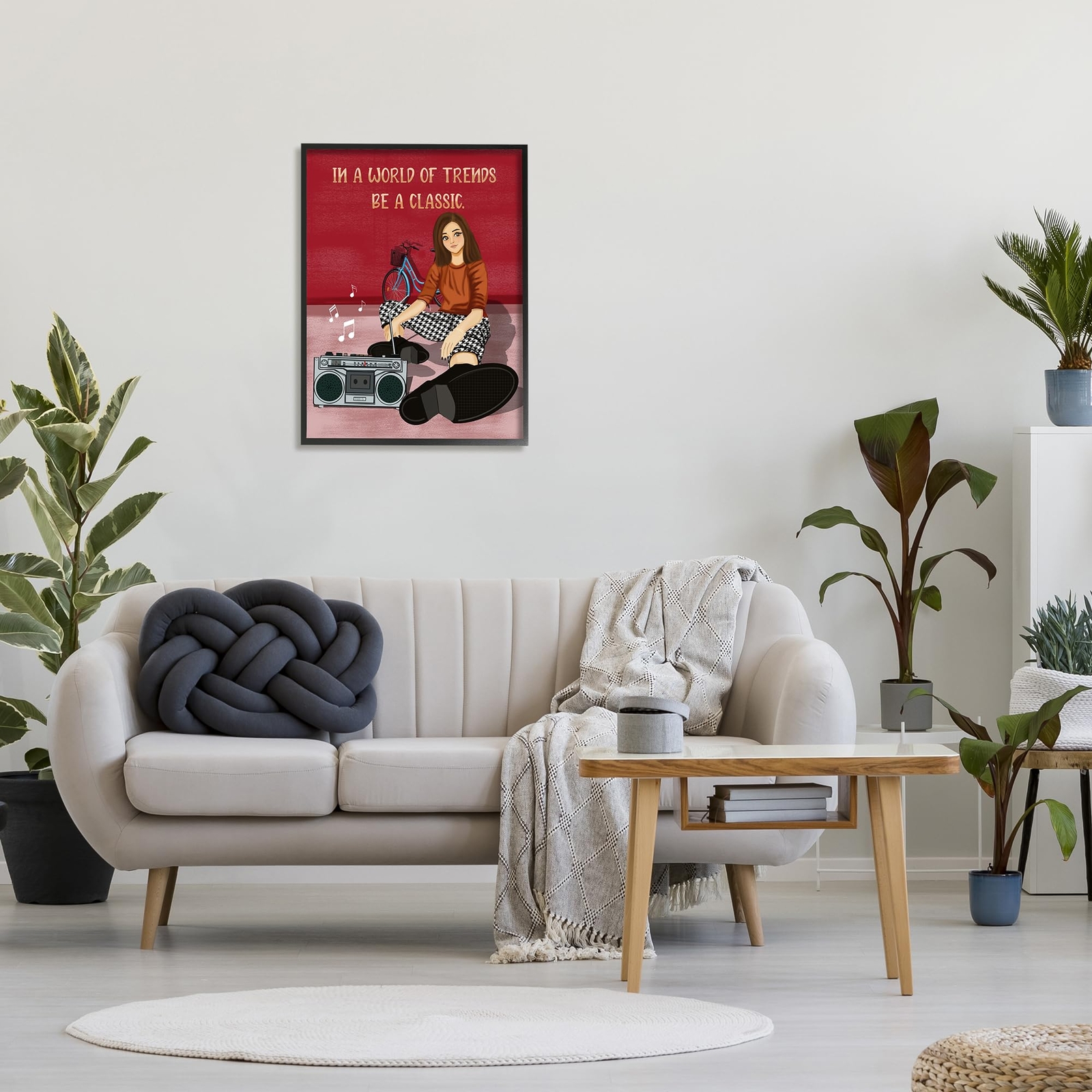 Framed Giclee Sizes Include Standard: 11 x 1.5 x 14 Large: 16 x 1.5 x 20 Oversized: 24 x 1.5 x 30 Wall Art is Ready to Hang with Hardware Free Hanging. No installation required. For Easy Set Up Lean or Layer Artwork on Shelf or Against Wall. Our giclée prints are carefully mounted on a durable MDF backing, and then perfectly finished in a 1.5 inch thick woodgrain frame. Mounted frame colors include black, gray farmhouse and white. Made In USA. Artwork Relates To: Female, Person, Woman, Motivational, Bicycle, Electronics, Music, Boombox, Radio, In a World of Trends Be a Classic Design by Saba Rauf