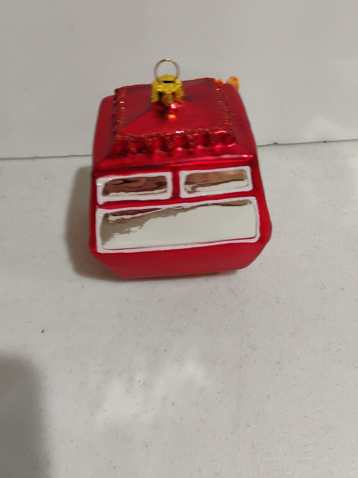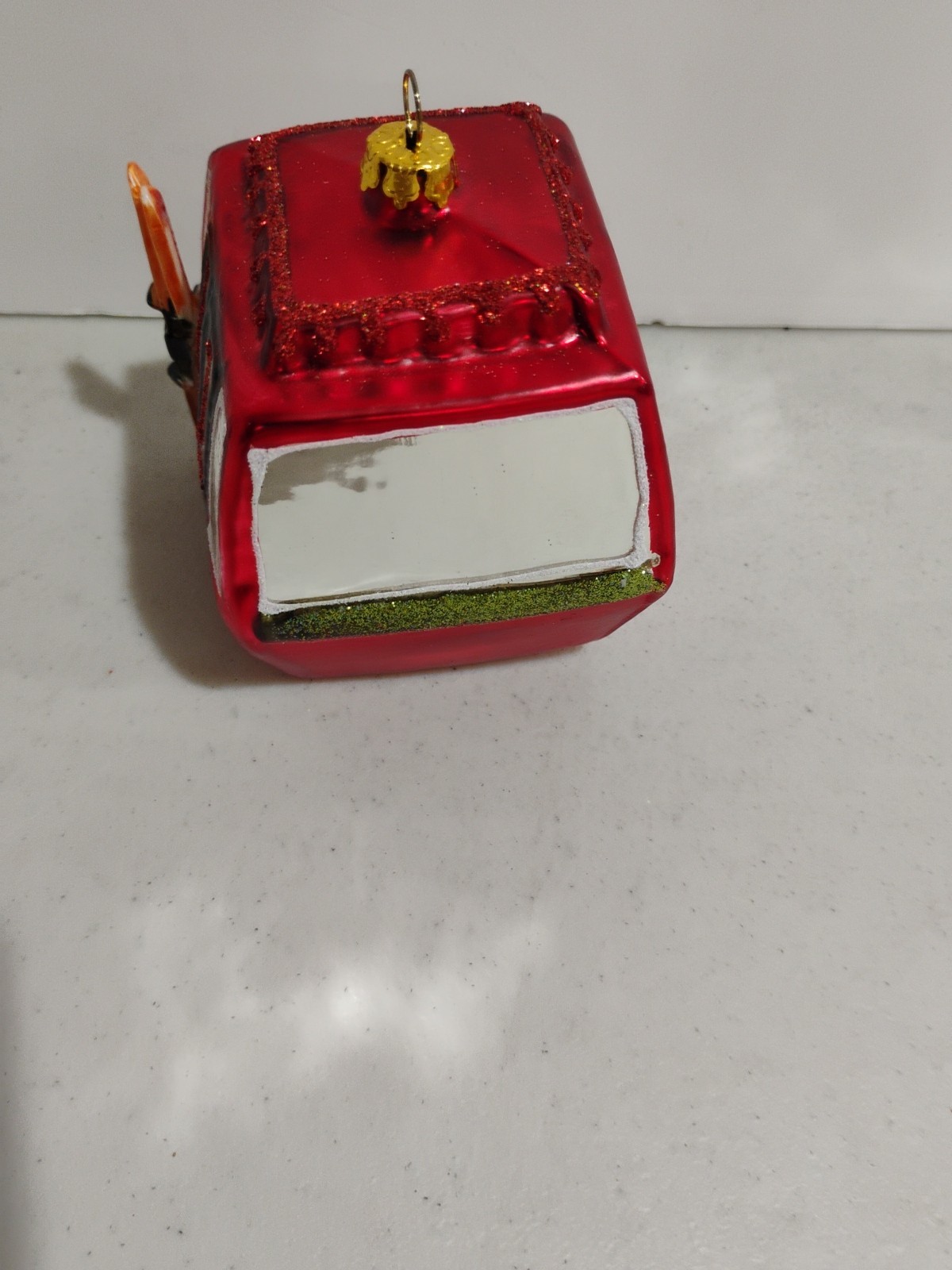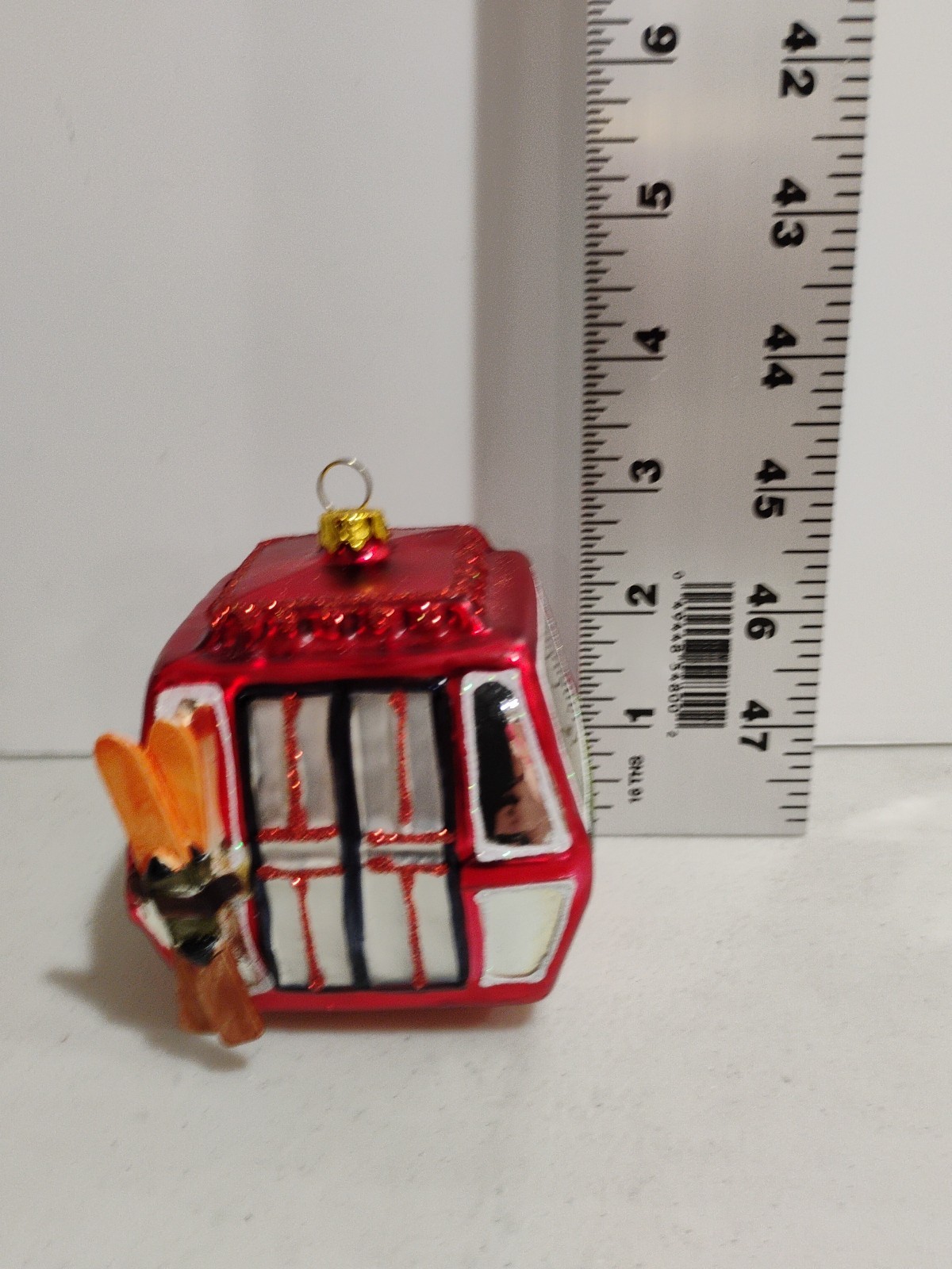 This item is a blown glass ski lift gondola Christmas ornament . These types of ornaments are handcrafted using traditional techniques, including mouth-blowing molten glass into molds and then hand-painting and glittering the details. Product Information & Where to Buy Material: Glass and some resin elements (like the skis). Design: The ornament features a classic red cable car design, complete with miniature skis and poles attached to the side, and often snowy accents.
