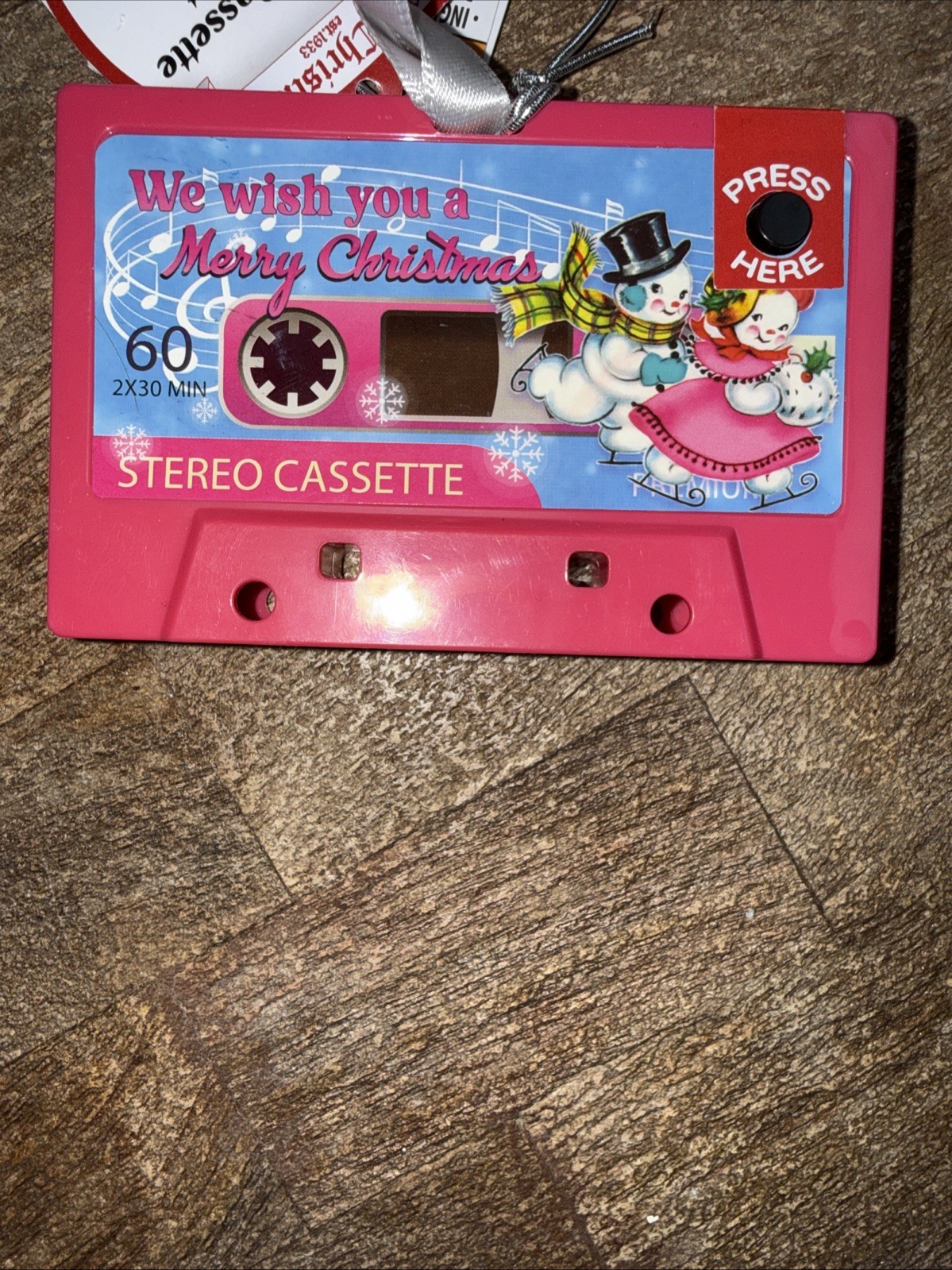 The Mr. Christmas Retro Musical Cassette Ornament in pink is a small, rectangular-shaped hanging decoration featuring a Santa Claus pattern. Made of plastic and manufactured in 2025 by Mr. Christmas, this ornament plays the classic "We Wish You A Merry Christmas" tune. Perfect for adults, this holiday-themed ornament adds a nostalgic touch to Christmas decor with its retro cassette design. The pink color adds a fun and festive flair to the holiday season.