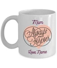 Mum Mug Mum Always And Forever Perfect Gift For Mom Product Details.. This high quality 11oz. ceramic white mug has a premium hard coat that provides crisp and vibrant color reproduction sure to last for years. Perfect for all hot & cold beverages. The highest quality printing possible is used. It will never fade no matter how many times you wash it. Material: 100% Ceramic. Print both sides. Dishwasher and Microwave Safe. High Gloss + Premium White Finish. Printed in the U.S.A. Personalized & Custom. We support personalized and custom mug to add custom, when placing an order, you can add notes to the "order note" in shipping address section. Also you can contact us directly via message. Shipping Info. Ready to ship in 1 to 2 business days, All products are made-to-order and proudly printed in the United States. Shipped by USPS and DHL, You will receive your order in 5-7 days. Replace & Refund. All products are defective during shipping broken, chipped will be replaced free of charge. You are not satisfied with the product, we will refund 100% money to you. If any other issues arise, please do not hesitate to message, we would be more than happy to assist you.
