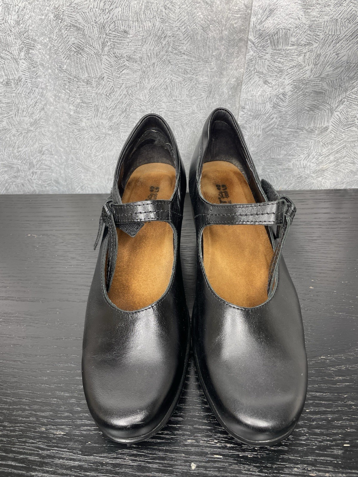 NAOT High Heel Mary Janes • size: 40/ US 9.5 • style: “Pleasure” • color: Black • leather uppers • ankle strap with Velcro closure • removable bow on strap • rubber, polyurethane, and latex outsole • heel height = 2.5” (platform = 0.5”) • $180 retail • made in Israel • very good pre-owned condition but with scuffs/scrapes in the leather at the toes (please see all photos, as they are part of the description)